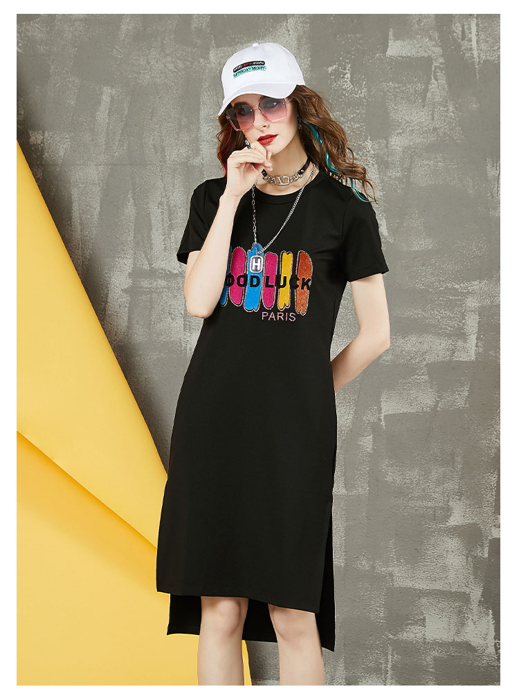 紛彩鯊魚歐洲站夏2023新款時尚圓領短袖T恤裙中長款休閑連衣裙女