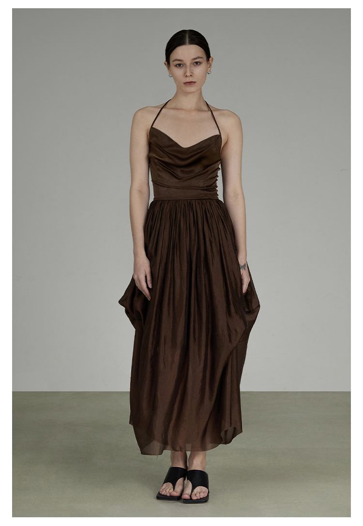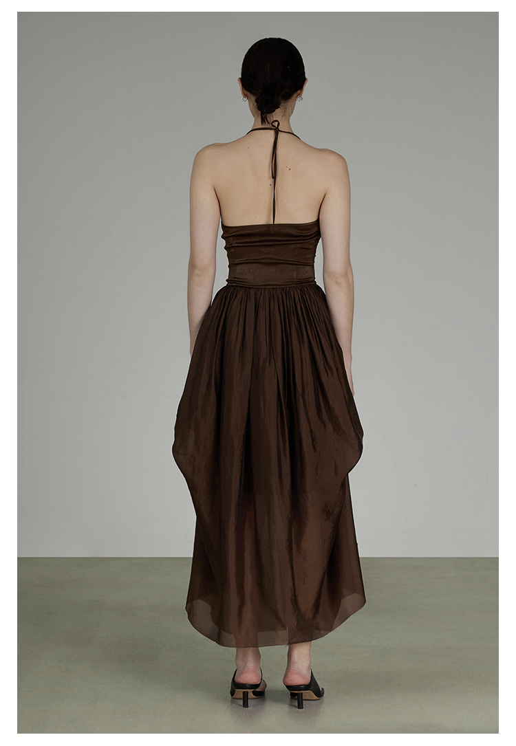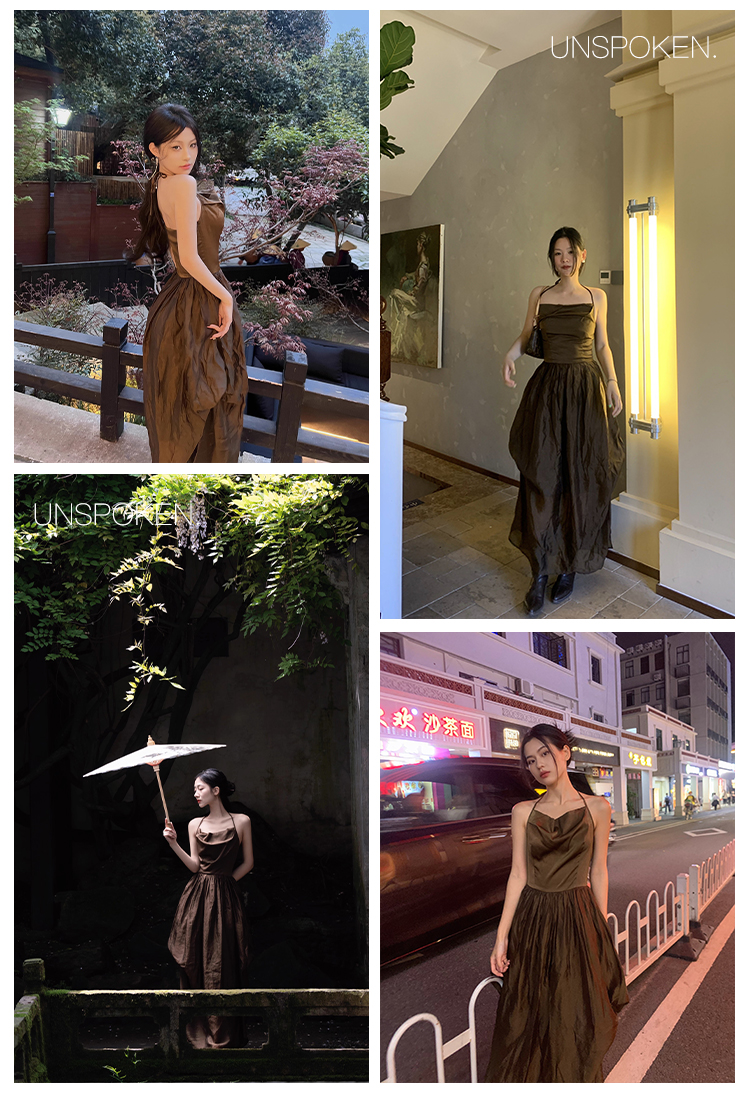 UNSPOKEN法式度假夏季掛脖吊帶褶皺修身氣質無袖連衣裙設計感長裙