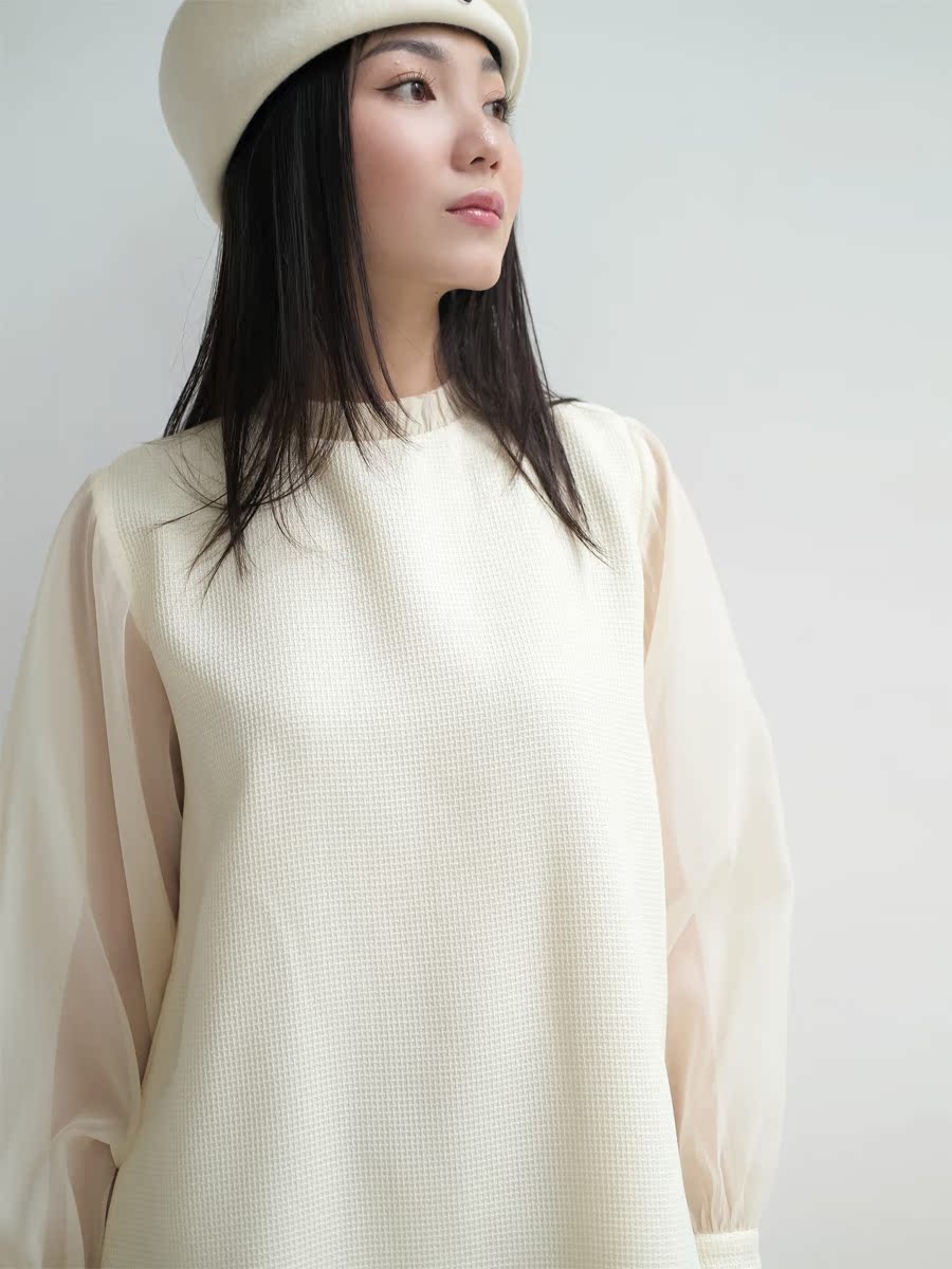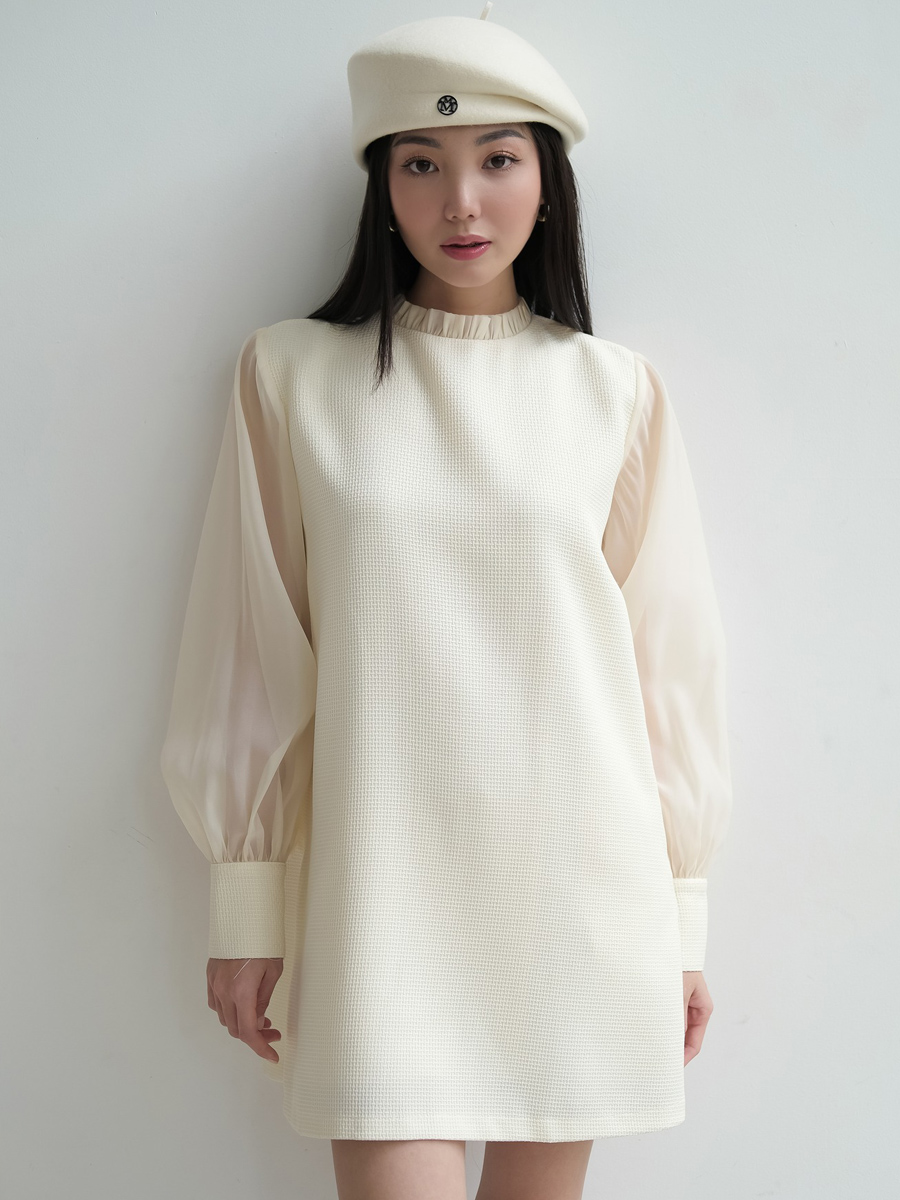 木耳邊精致小立領寬松大碼休閑舒適罩衫歐根紗泡泡袖小黑裙