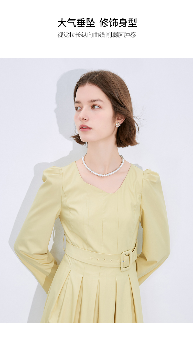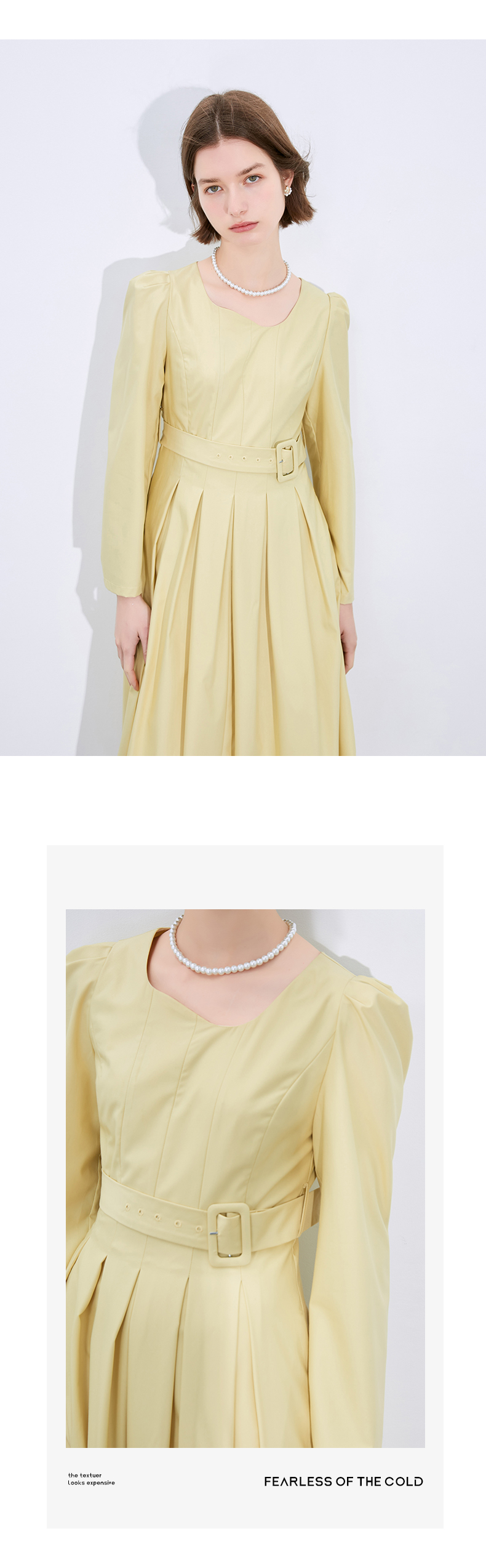 Basic House/百家好泡泡袖百褶連衣裙女2023秋季新款收腰顯瘦裙子