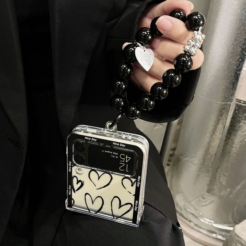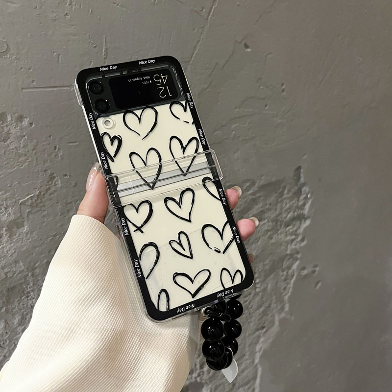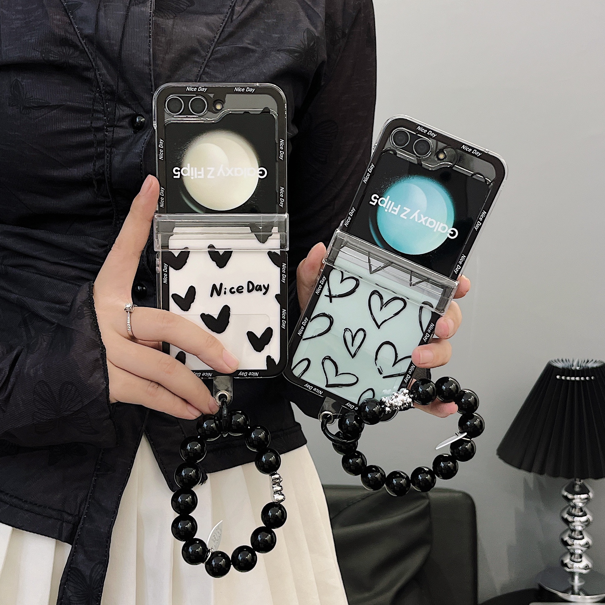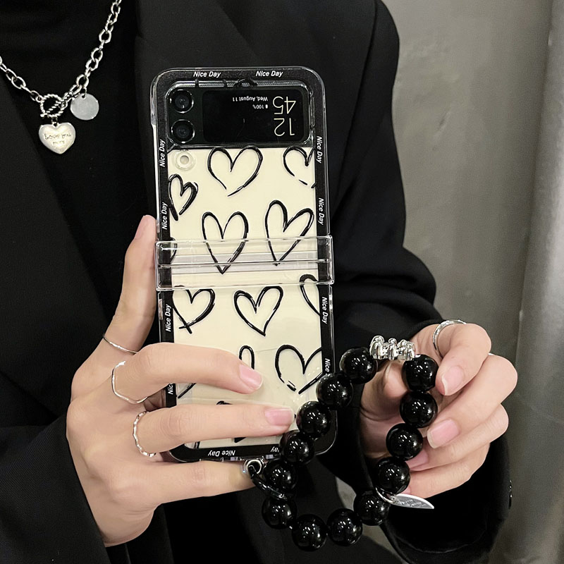 適用三星zflip5手機殼可愛INS風黑愛心波點鉸鏈全包硬保護套女新zflip 3殼折疊屏手提短鏈繩flip4簡約zflip3