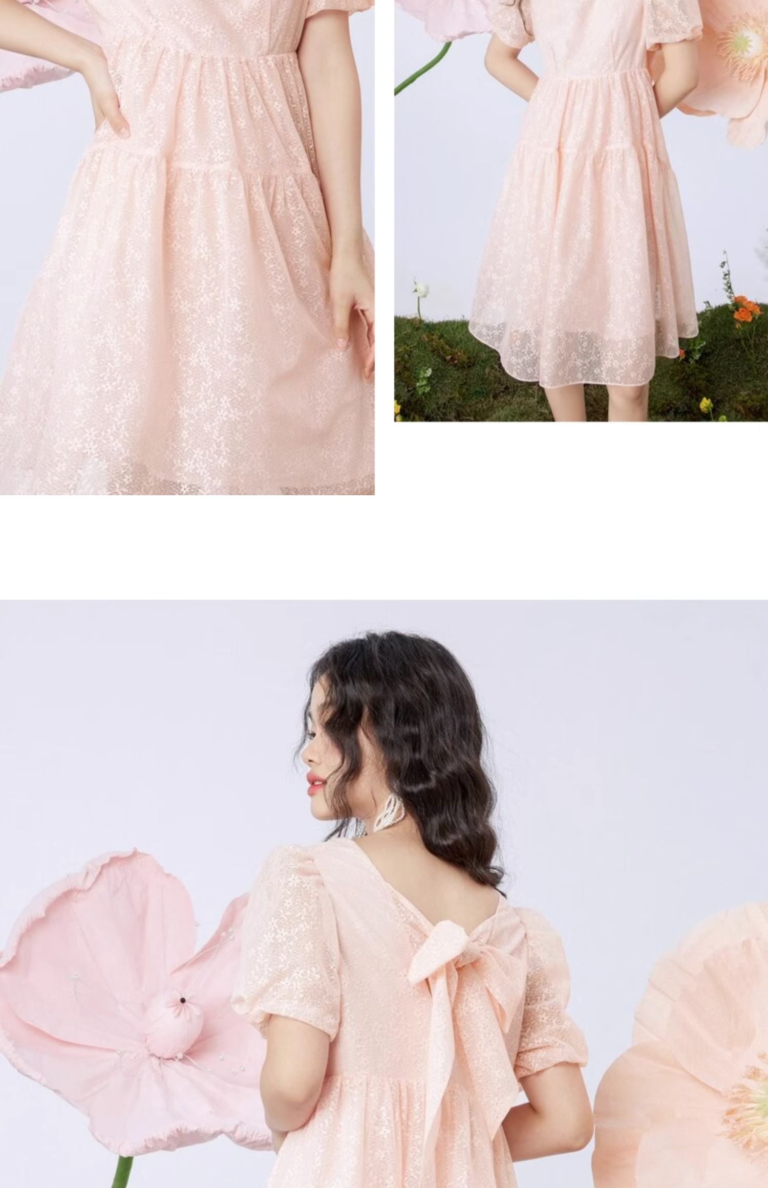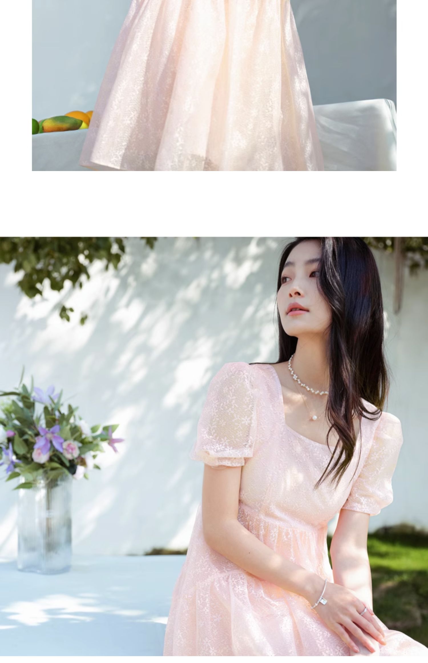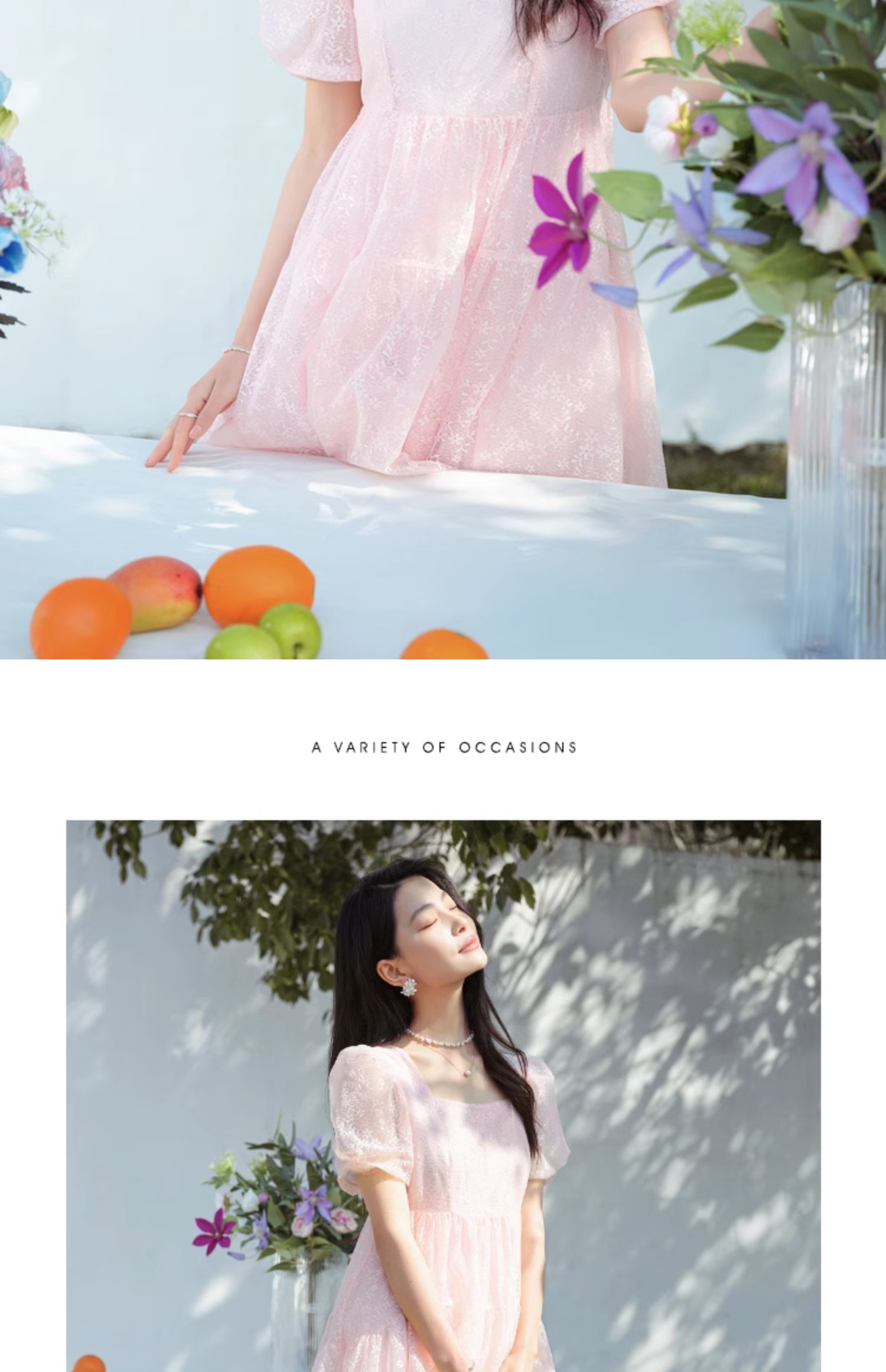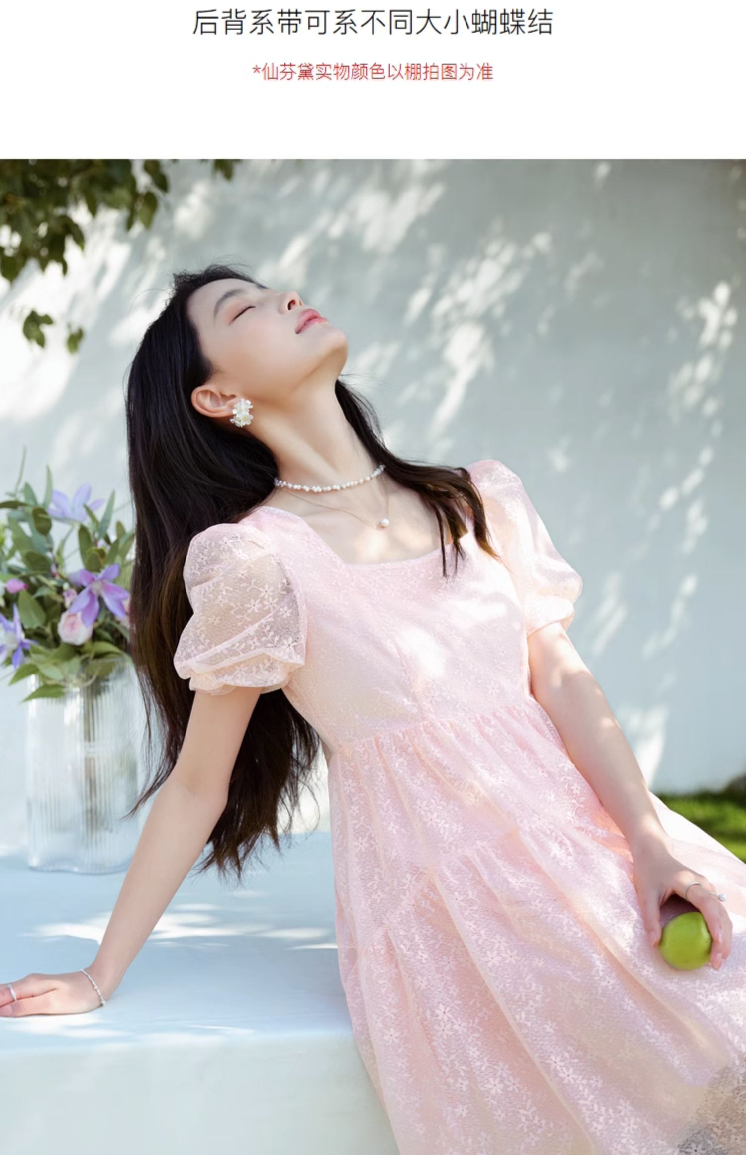 洛可可2023秋季新款浪漫粉印花方領褶皺俏皮女連衣裙仙氣超仙森系