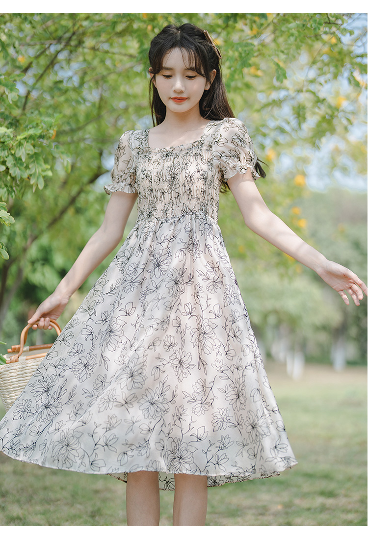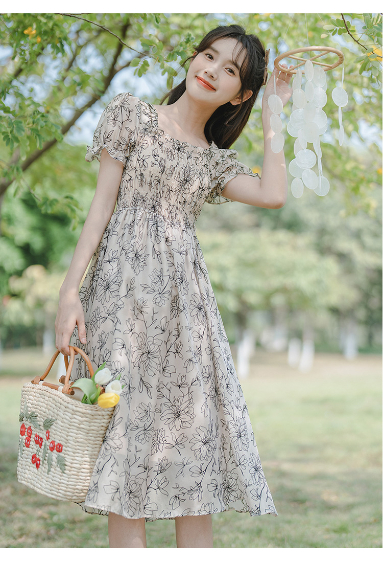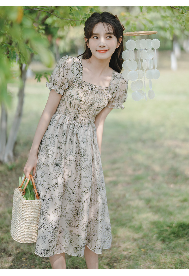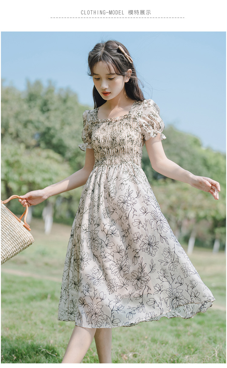 高級感裙子小個子茶歇絕美法式復古收腰顯瘦氣質方領碎花連衣裙女