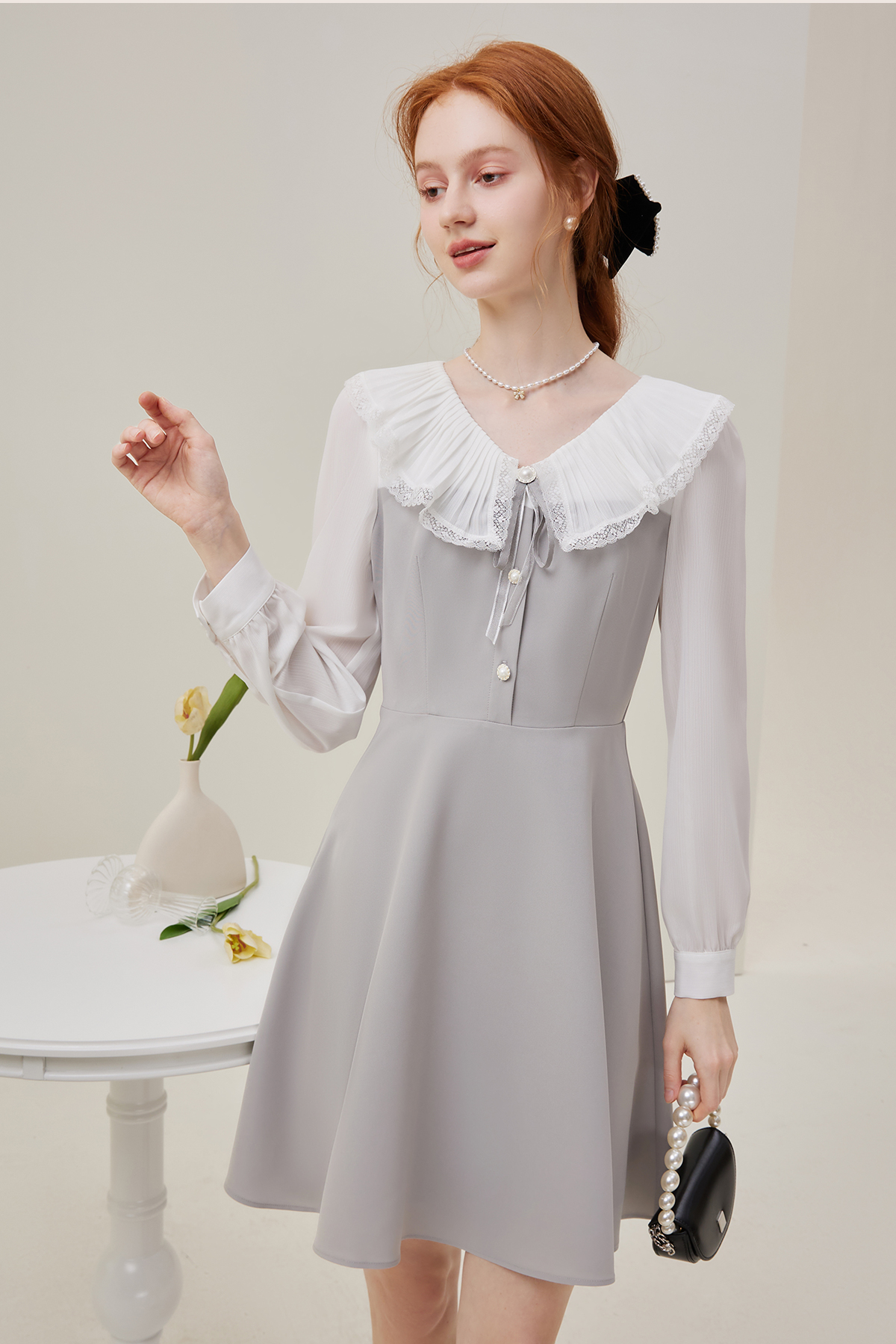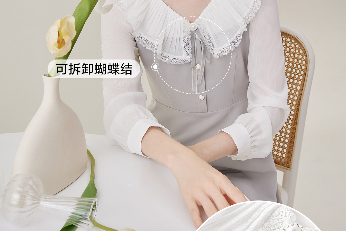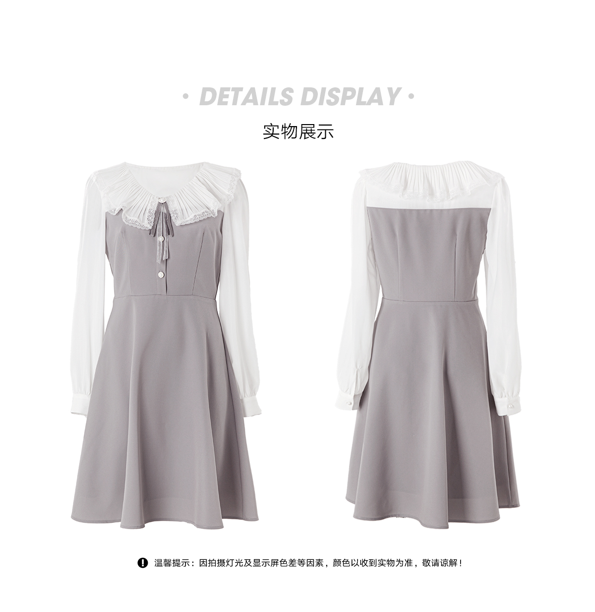 衣紗布菲湖眉小香風連衣裙女2023春季新款蕾絲娃娃領修身法式裙子