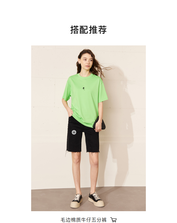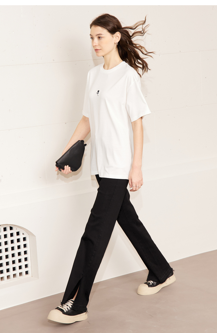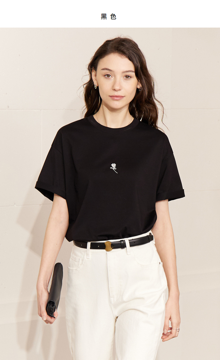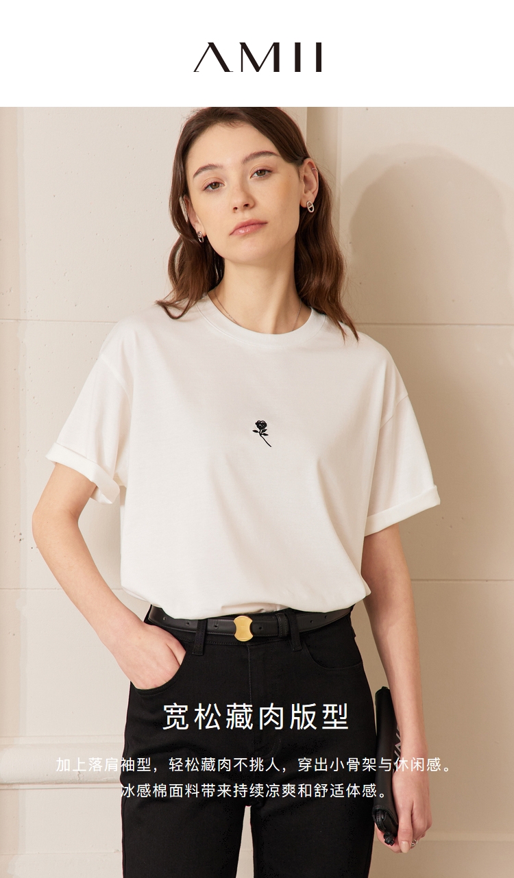 Amii2023夏新款百搭圓領落肩袖玫瑰繡花冰感棉白色T恤女寬松上衣