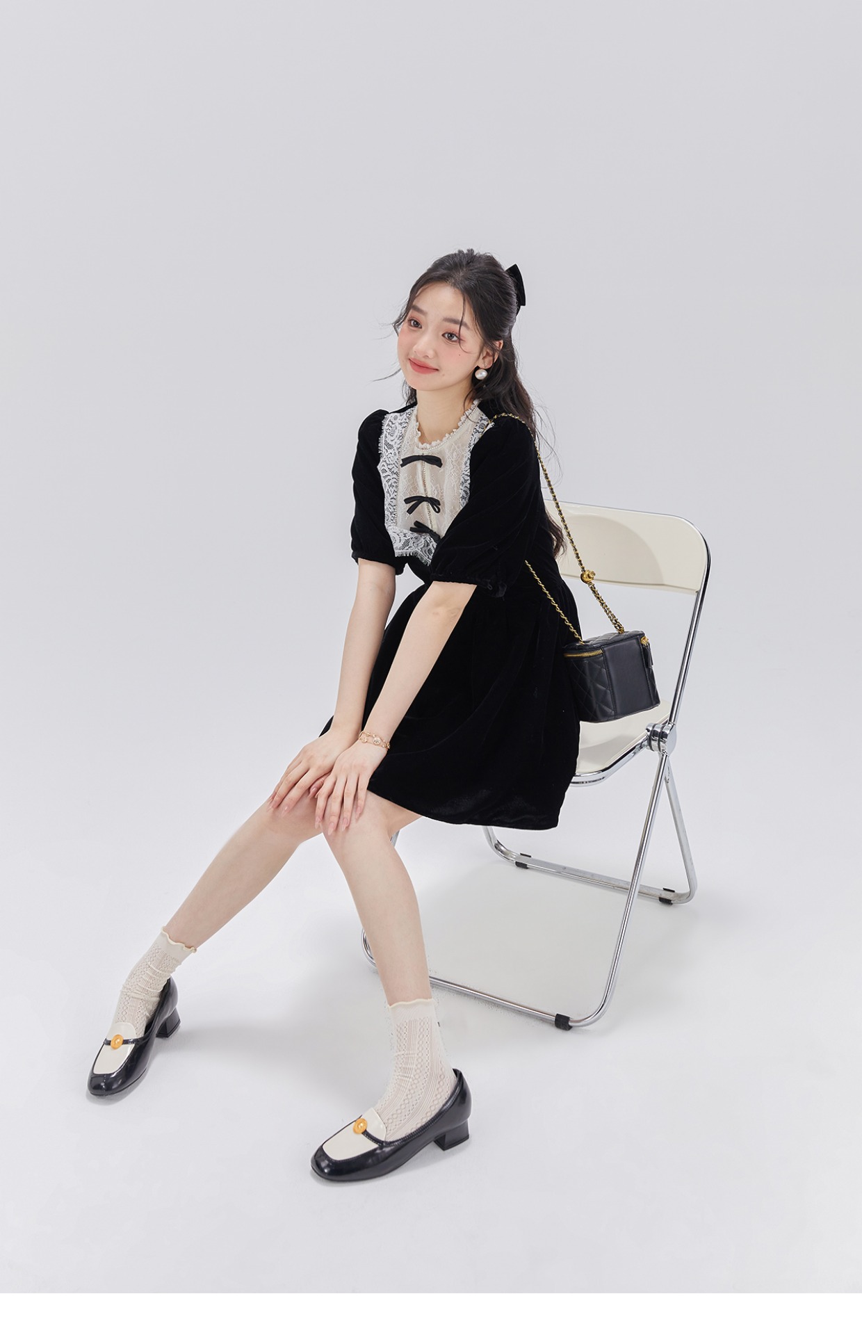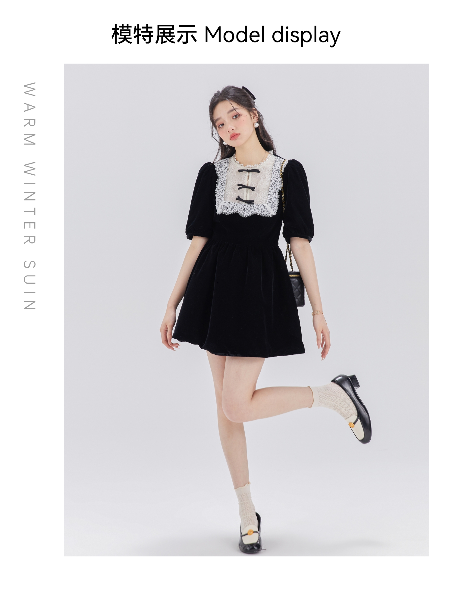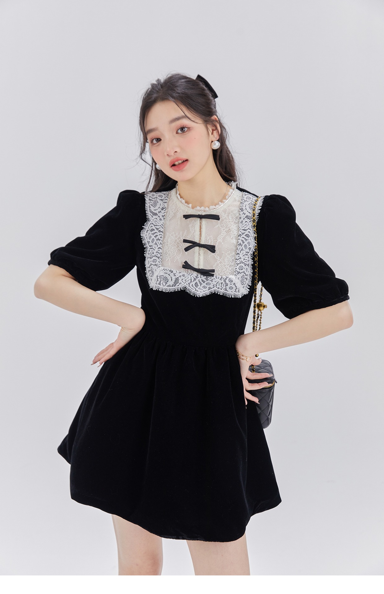 小鹿的泡芙 中古少女 蕾絲拼接絲絨連衣裙