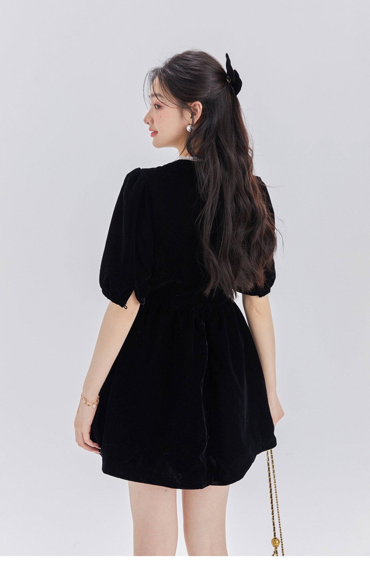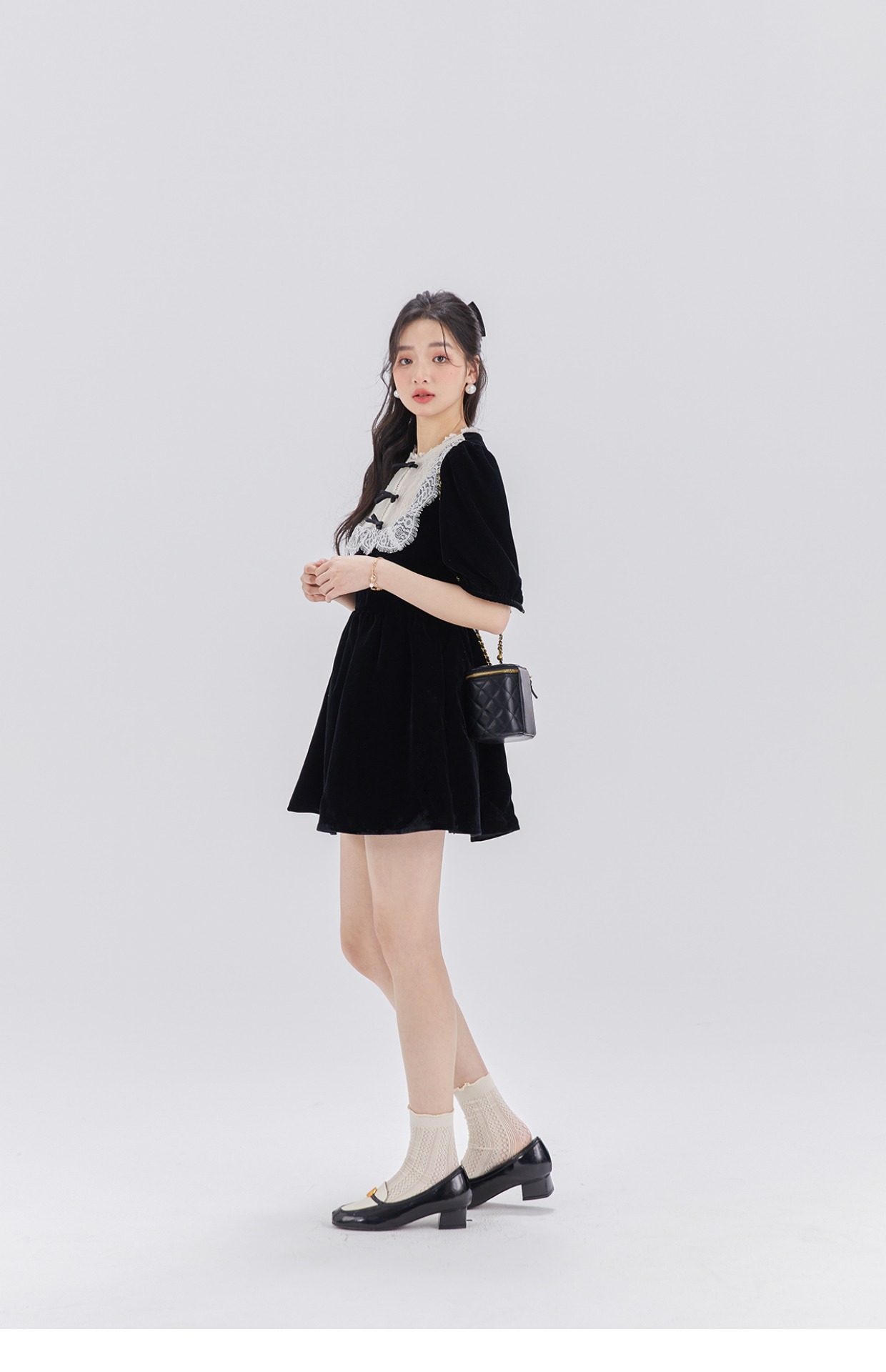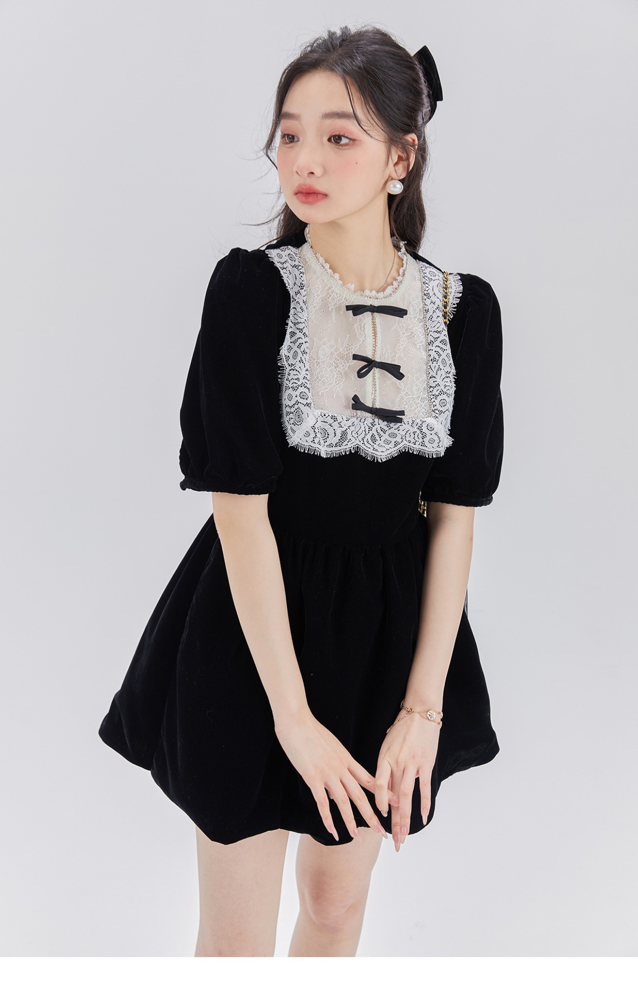 小鹿的泡芙 中古少女 蕾絲拼接絲絨連衣裙