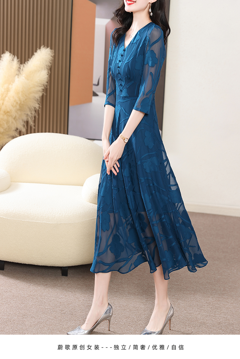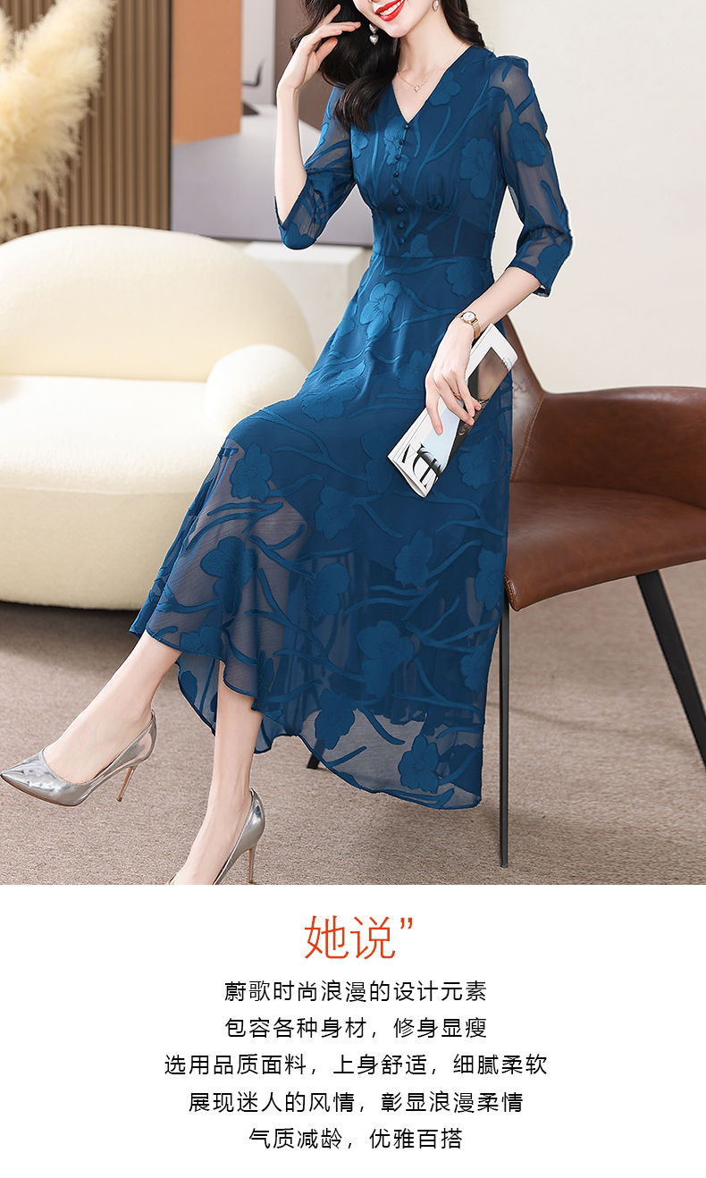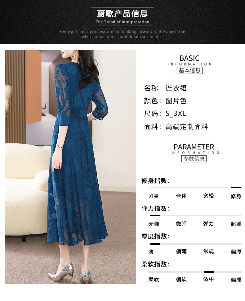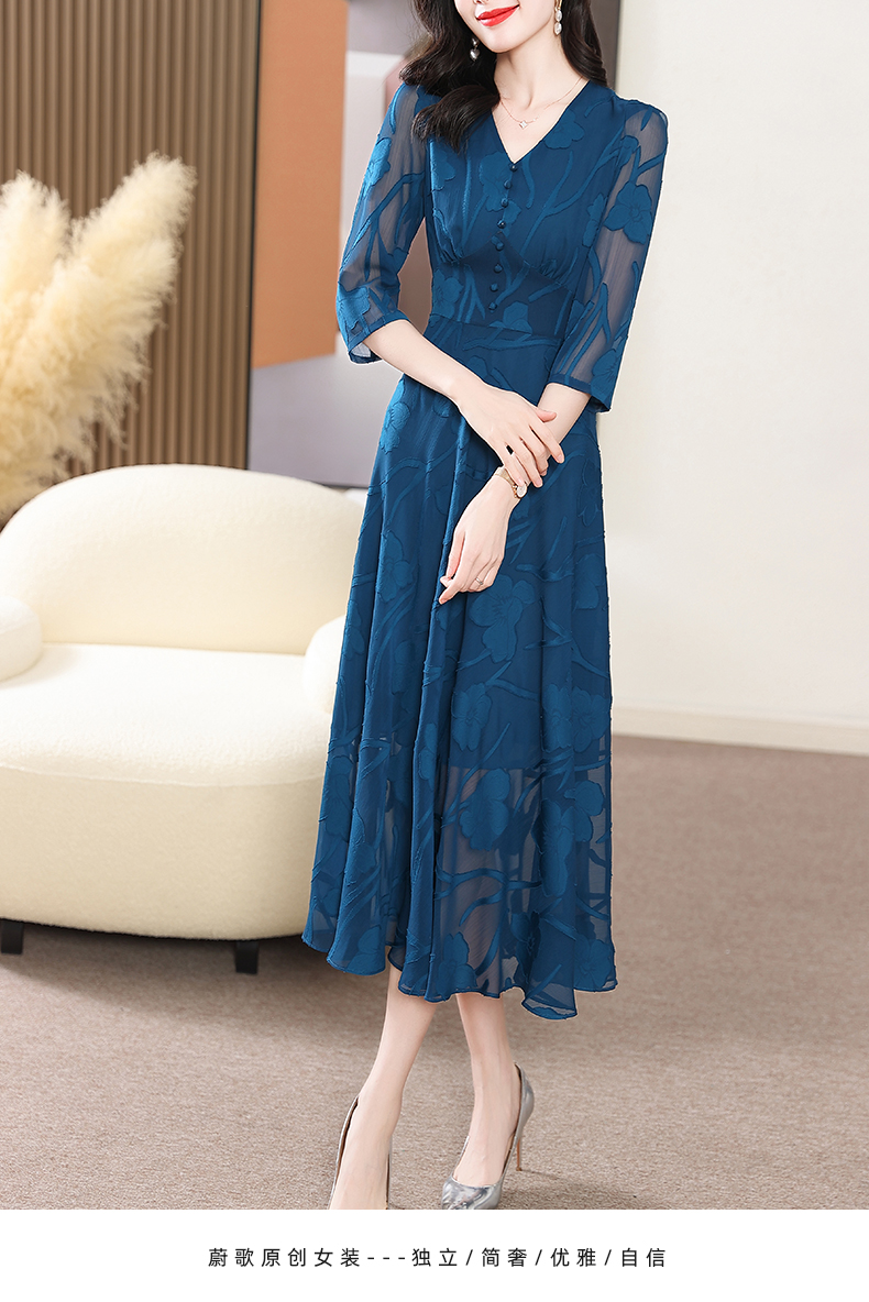 藍色長款連衣裙女2023早春新款收腰顯瘦長款過膝雪紡氣質大擺長裙