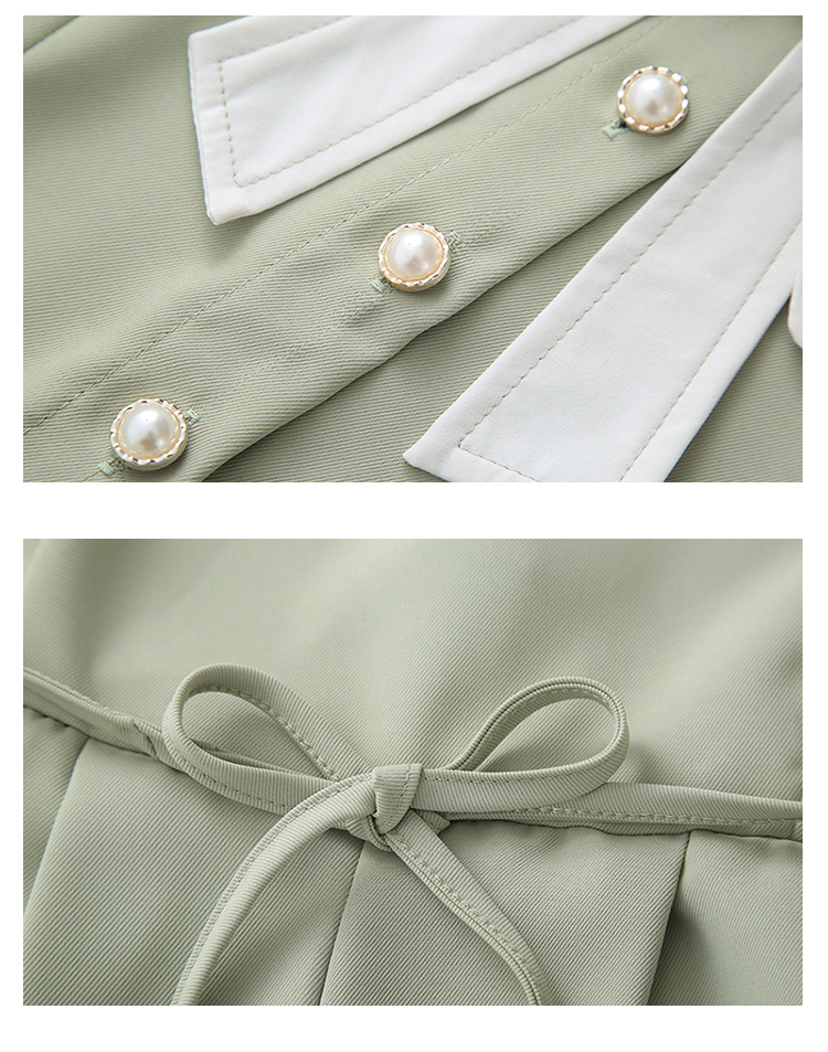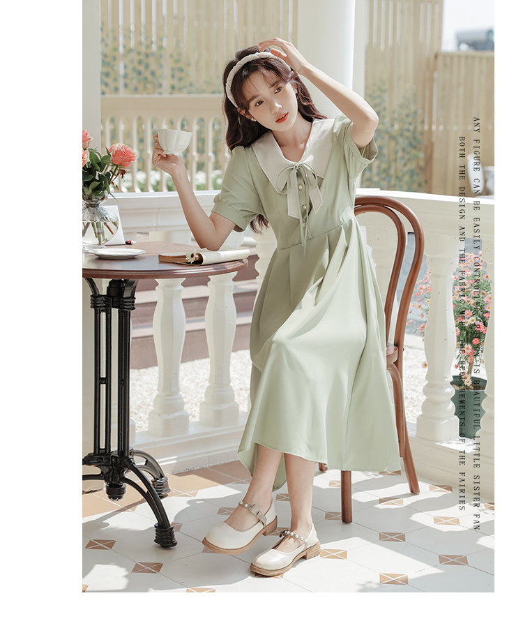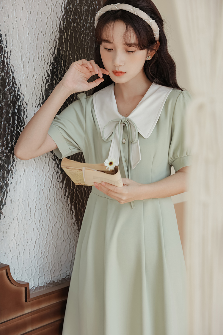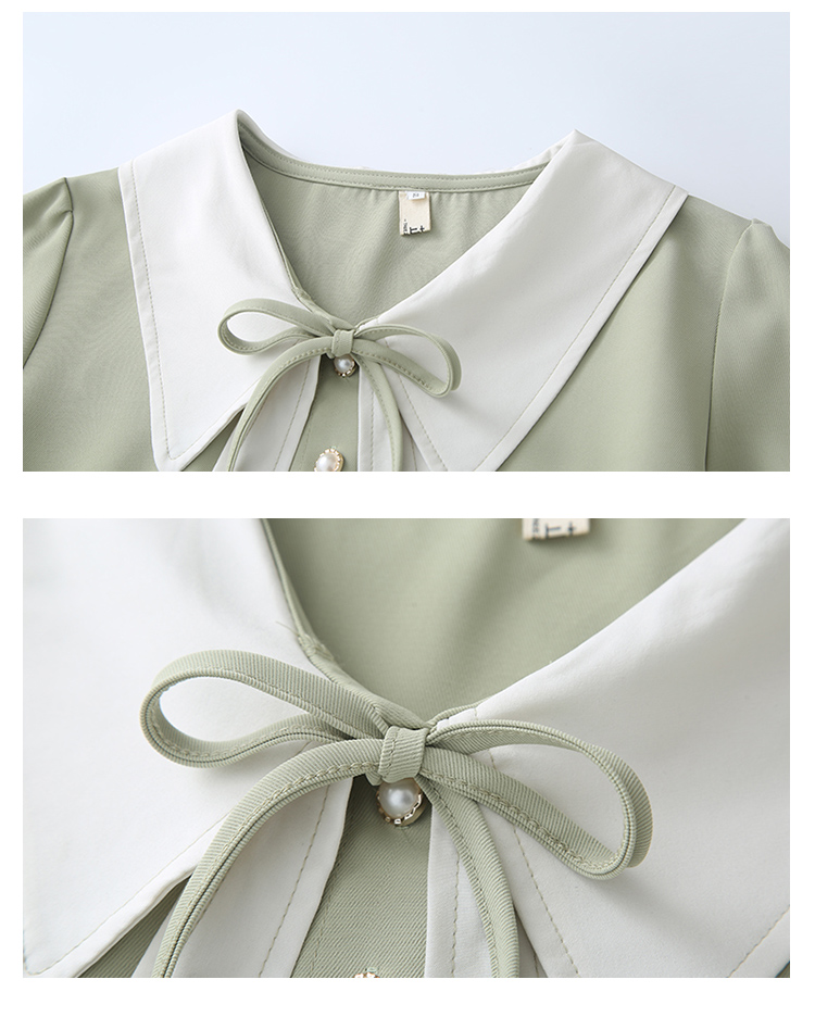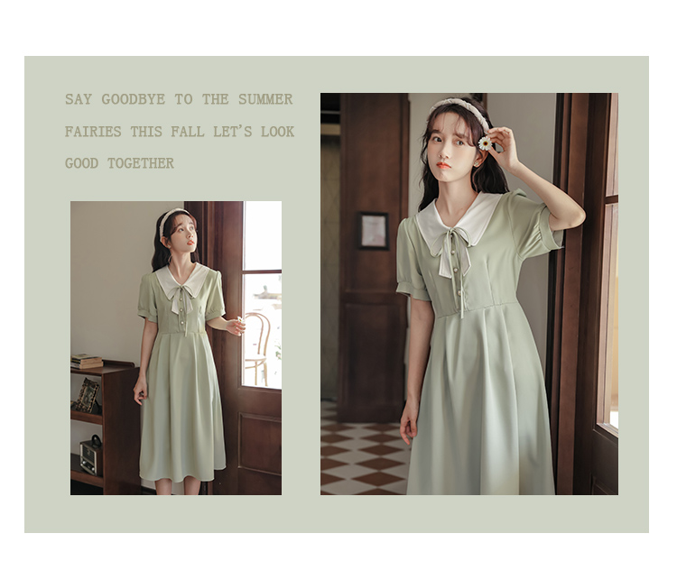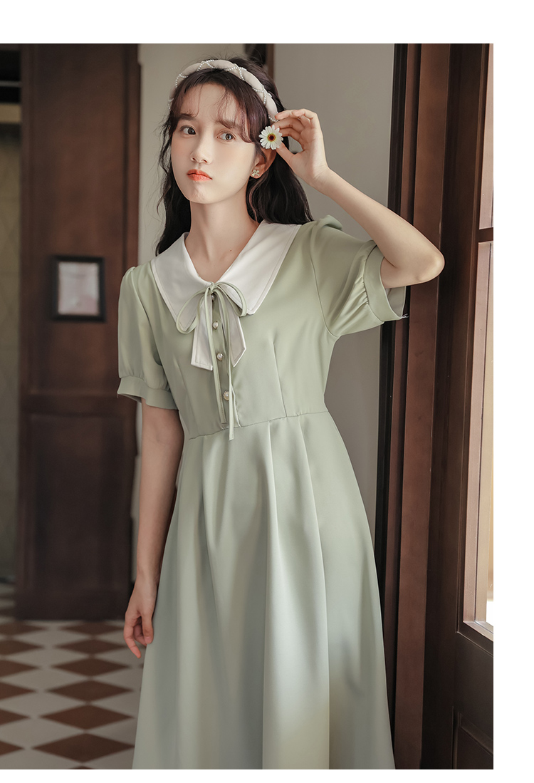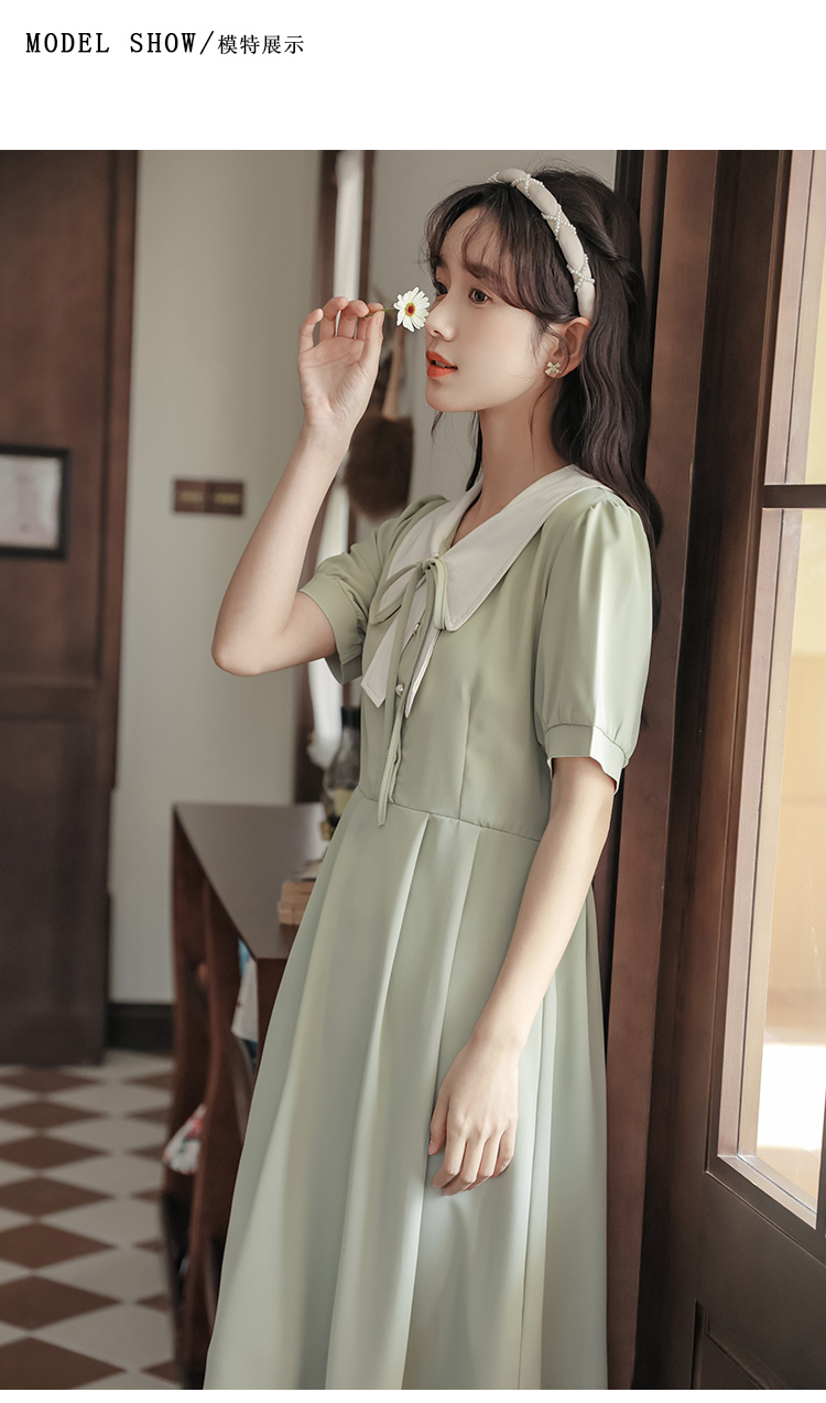 2023夏季女裝新款茶歇法式初戀連衣裙女小個子綠色娃娃領氣質裙子