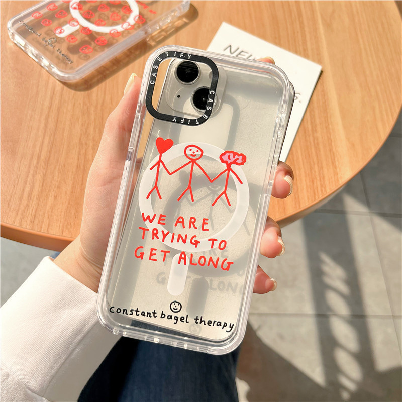 iphone14promax手機殼女款磁吸防摔透明白色卡通可愛涂鴉火柴小人明星同款笑臉英文字母蘋果13保護套小清新