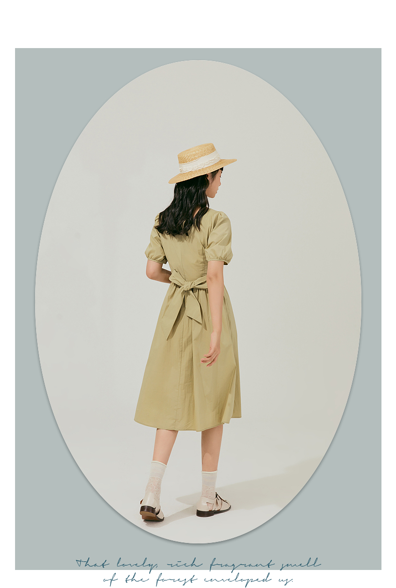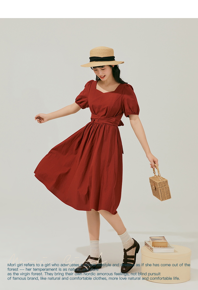 紫涵泡泡袖V領連衣裙公主風綁帶收腰中長裙夏季新款2023百搭裙子