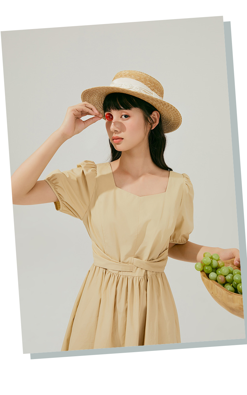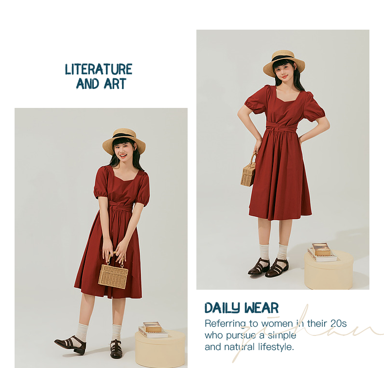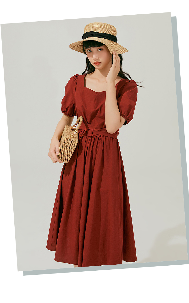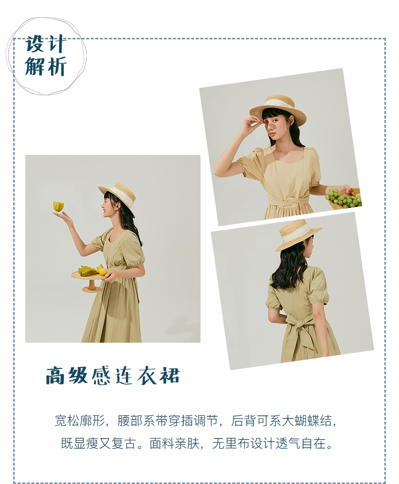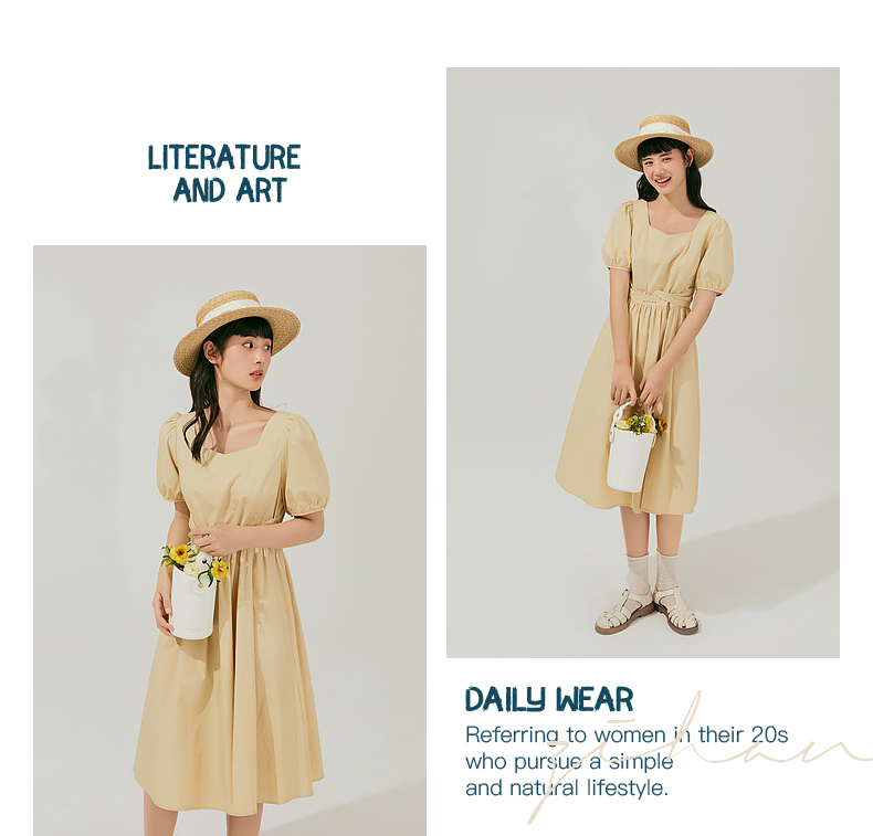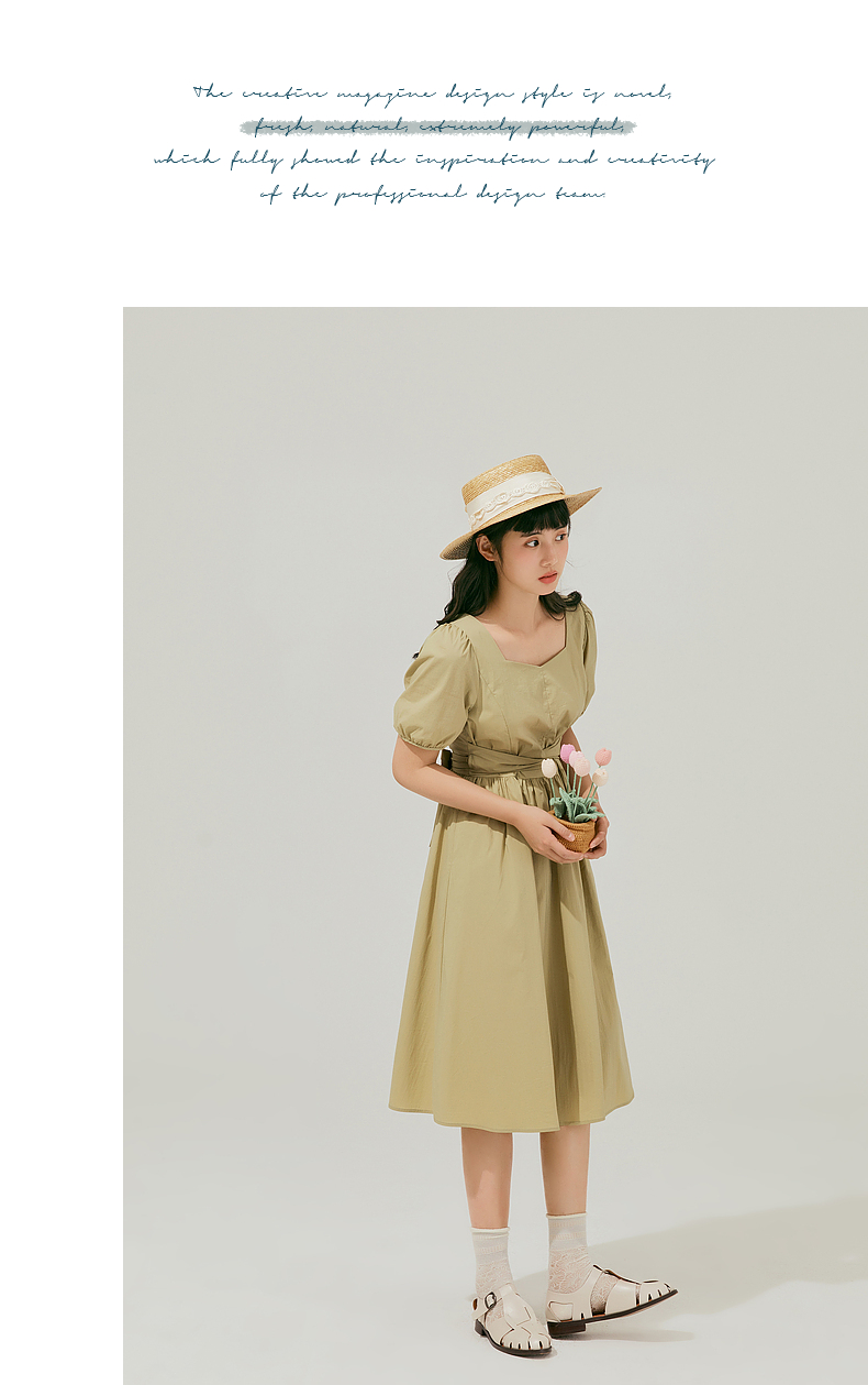 紫涵方領收腰連衣裙法式文藝中長裙2023夏季新款簡約通勤百搭裙子