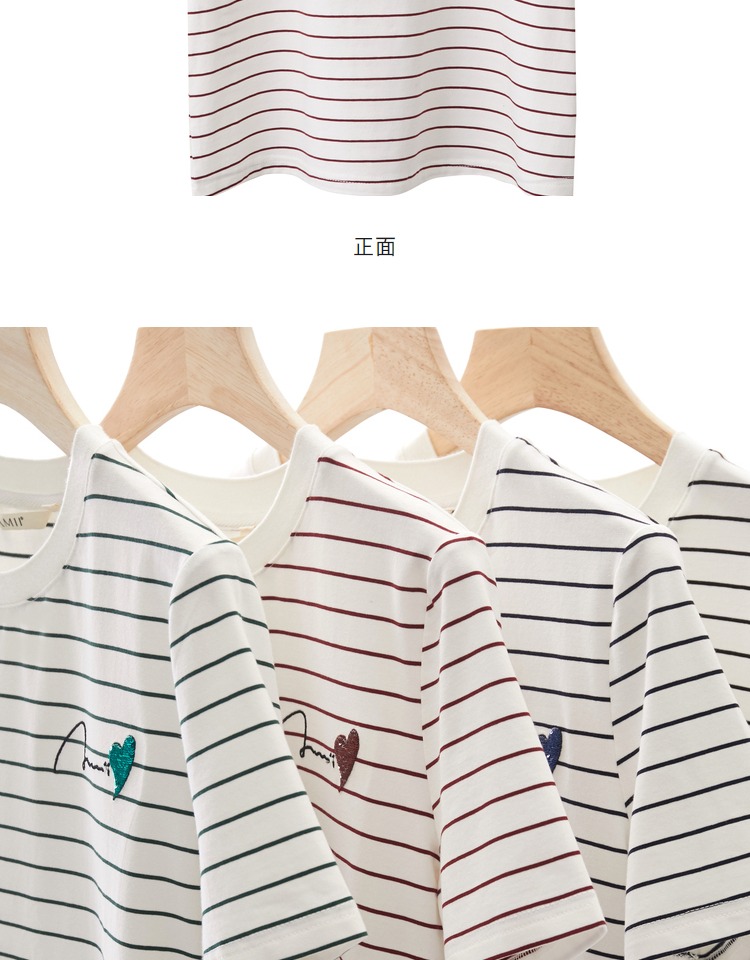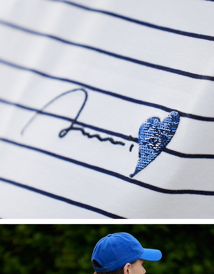 Amii純棉條紋短袖t恤女2023新款夏季愛心珠片繡秋季打底內搭上衣