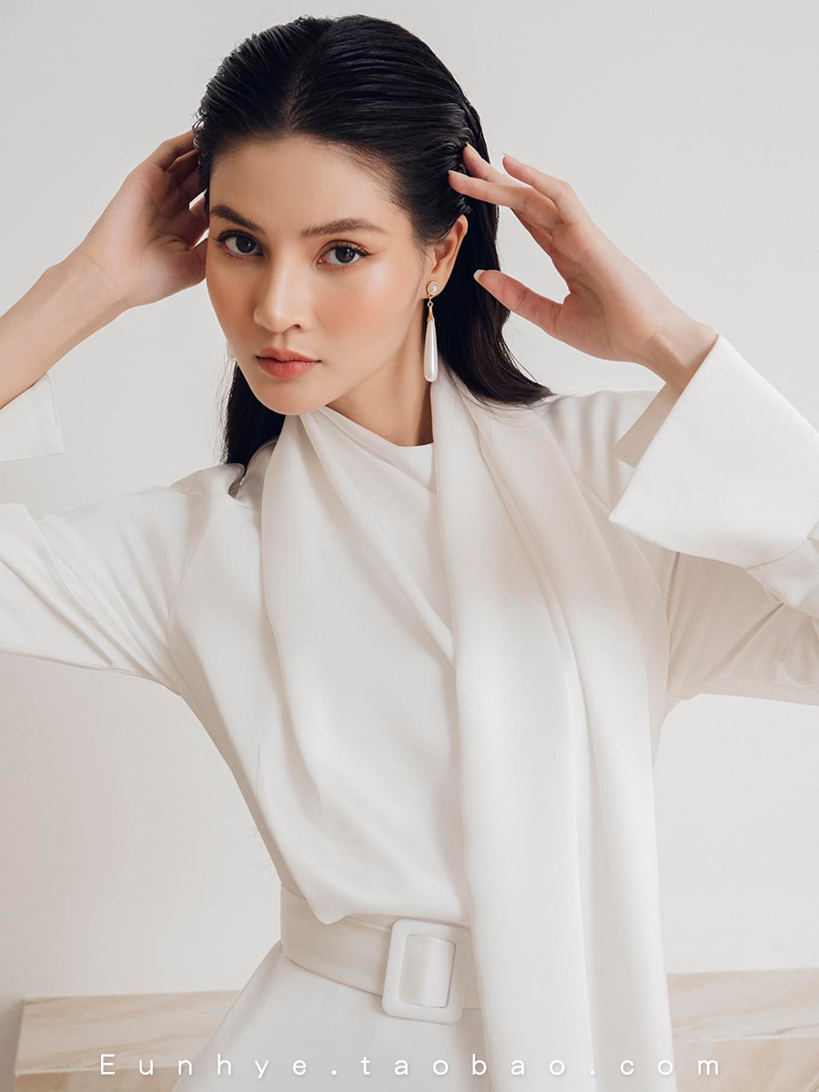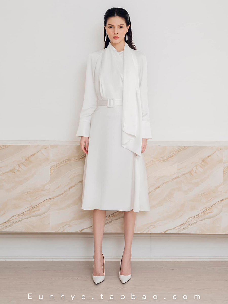 越南小眾WHITEPLAN 2023年春季新款溫柔干練珠光白飄帶連衣裙