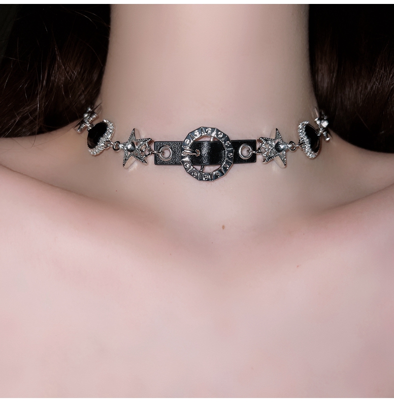 辣妹風~高級感時髦皮質拼接滿鉆五角星星設計感項鏈短款choker潮