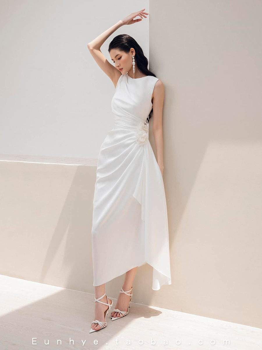 越南小眾WHITEPLAN 2023年春季新款珠光白花朵收腰圓領無袖長裙