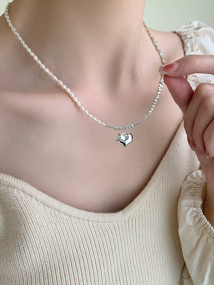 S925銀碎銀子項鏈女天然珍珠愛心吊墜拼接鎖骨鏈小眾設計感潮手鏈