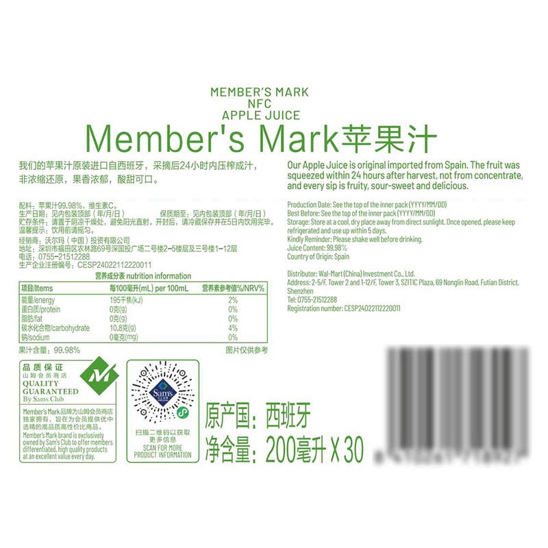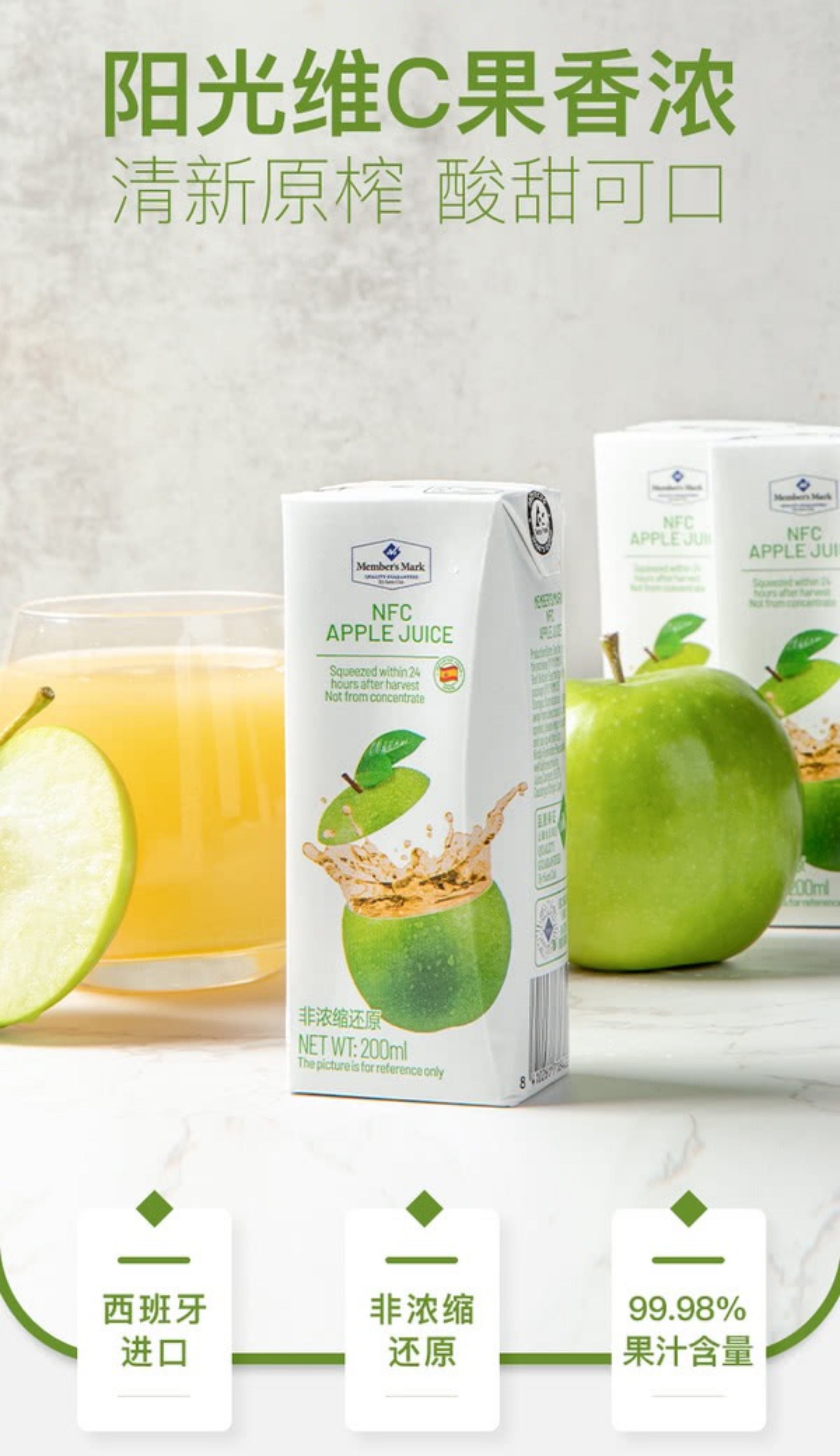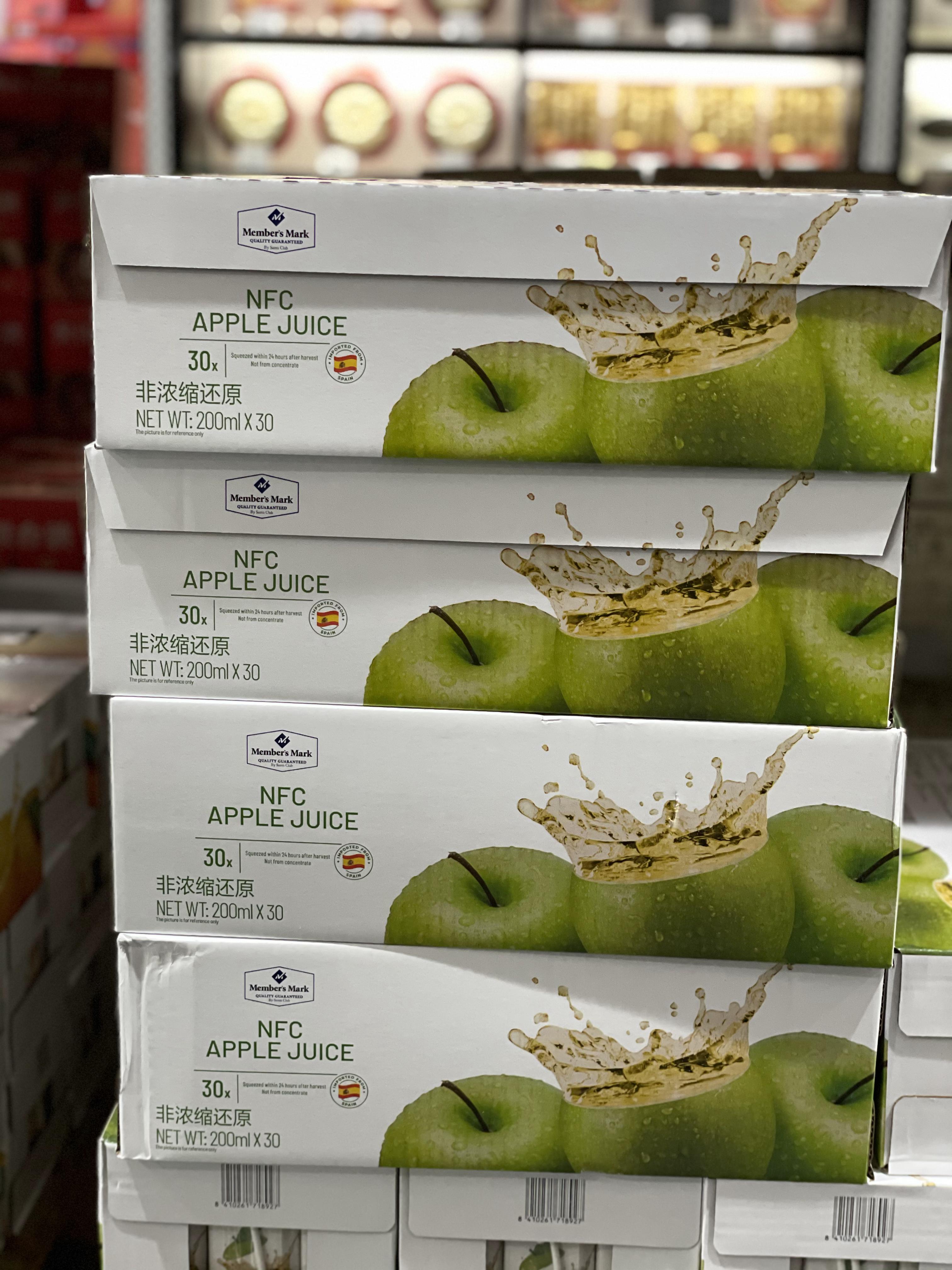 山姆超市代購MM西班牙進口NFC蘋果汁200ML*30營養非濃縮還原飲料