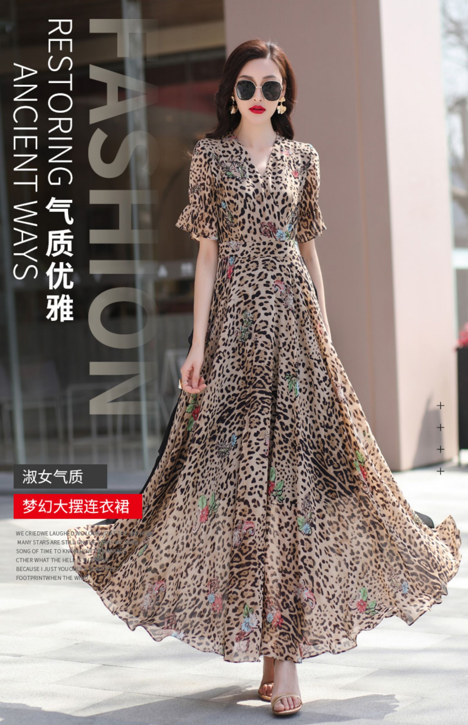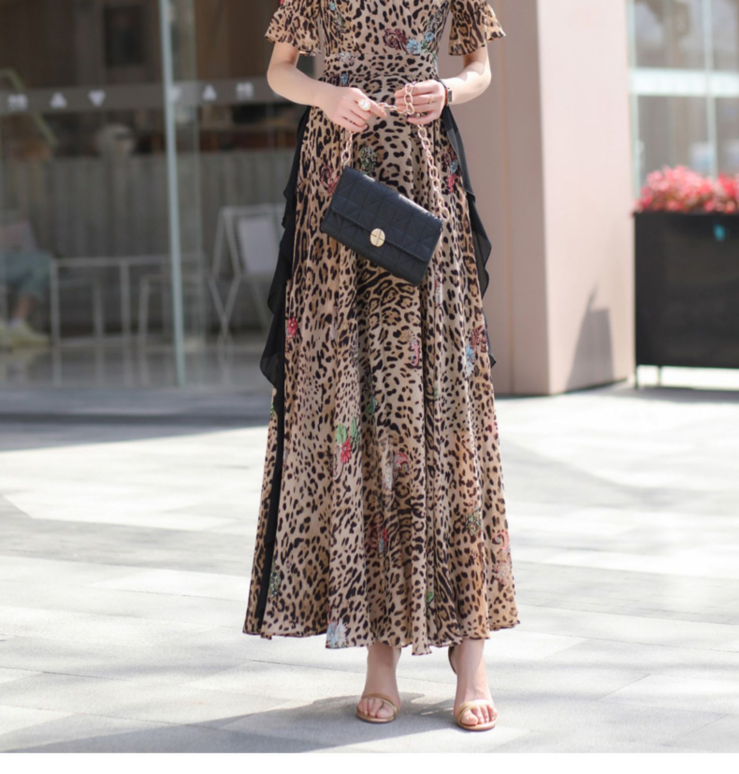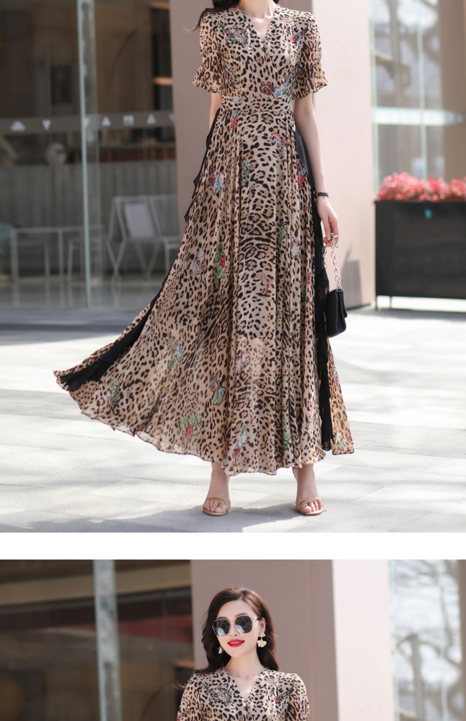 豹紋連衣裙修身顯瘦高級感2023夏季新款氣質大擺超長裙到腳踝1654