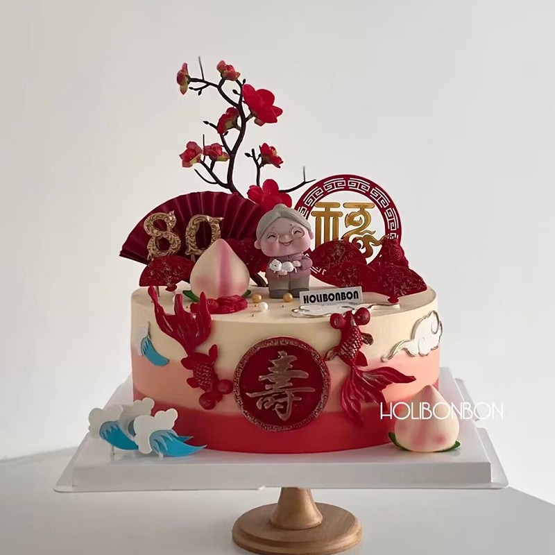 烘焙祝壽蛋糕裝飾錦鯉金魚老奶奶梅花祥云壽桃插件配件擺件生日