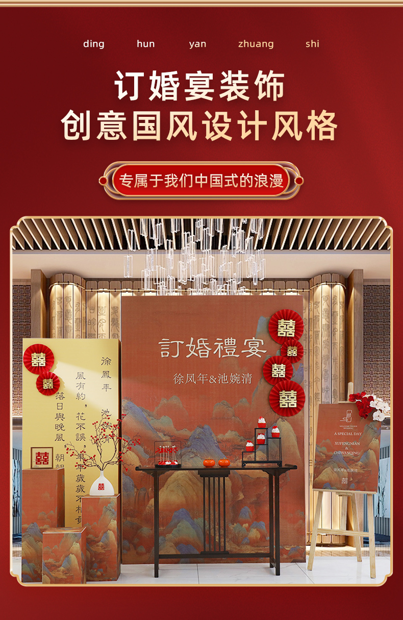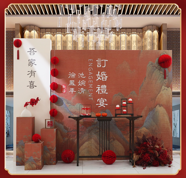 網紅新中式訂婚布置裝飾場景擺件全套大全定親宴高級感背景板kt板