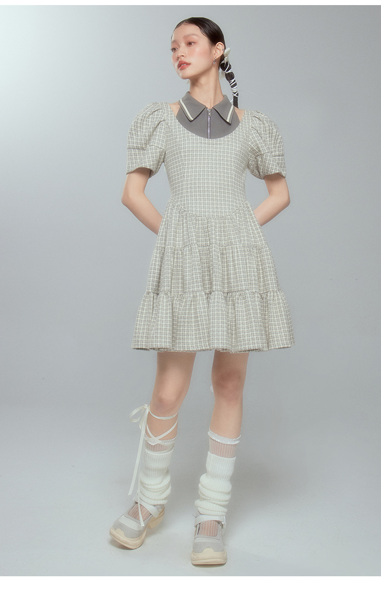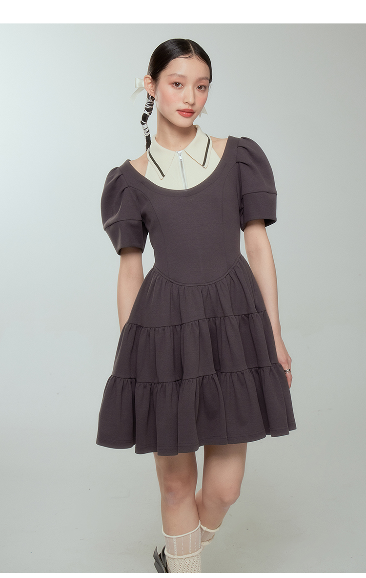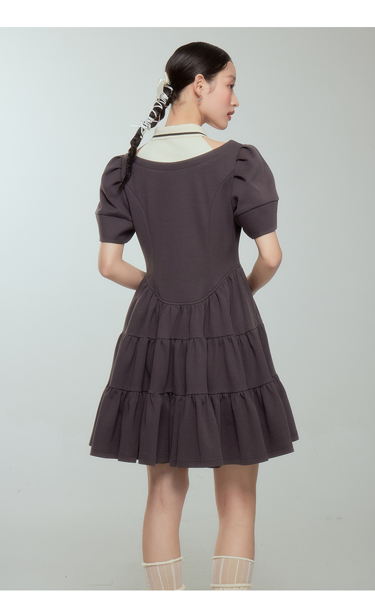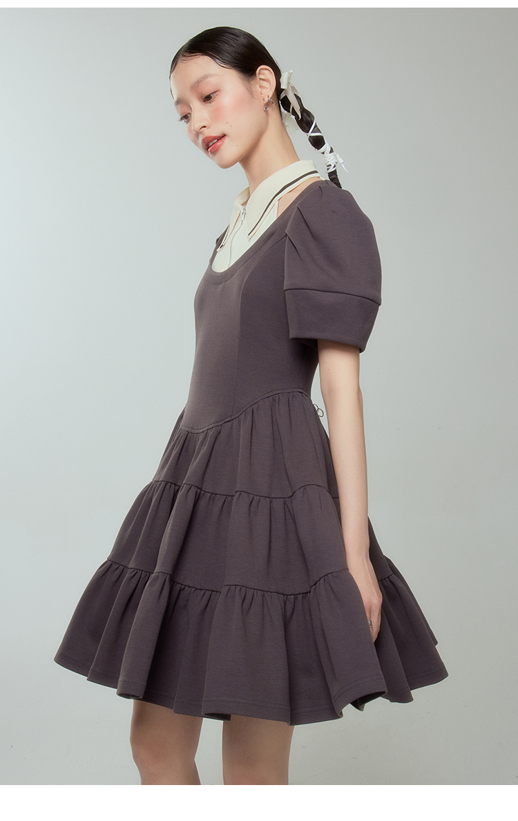 DIDDI 原創設計 背心假兩件撞色連衣裙文藝復古灰色拼接蓬蓬裙春