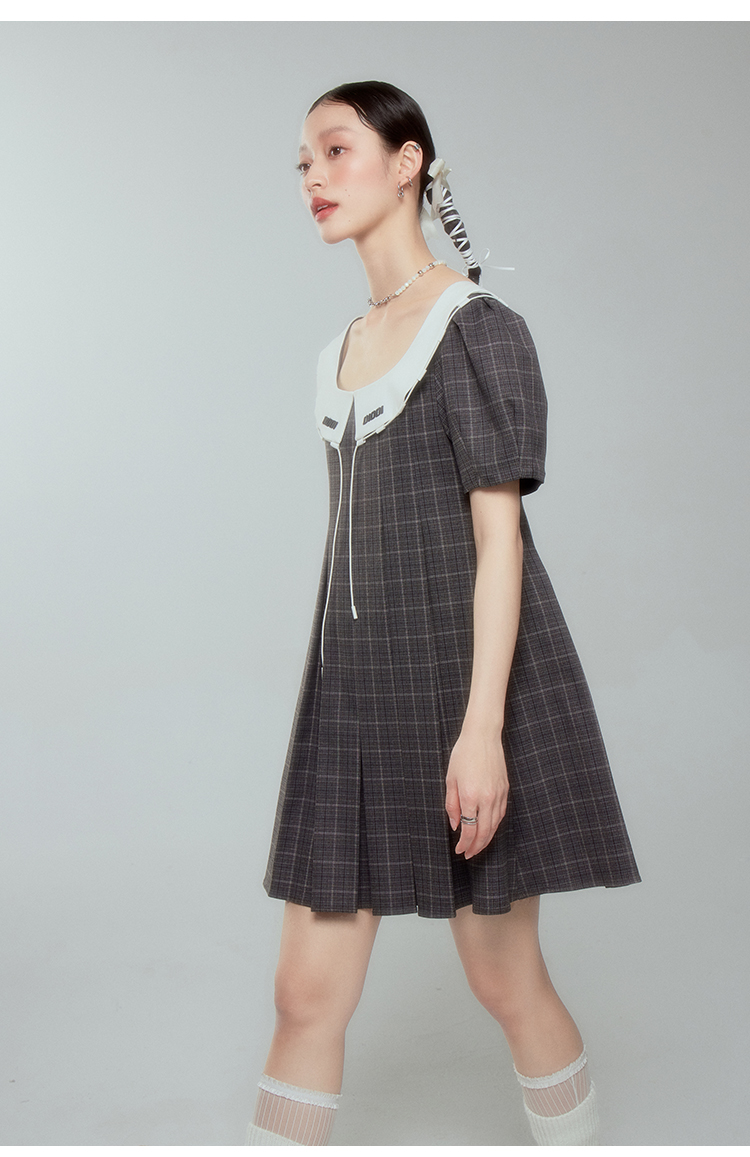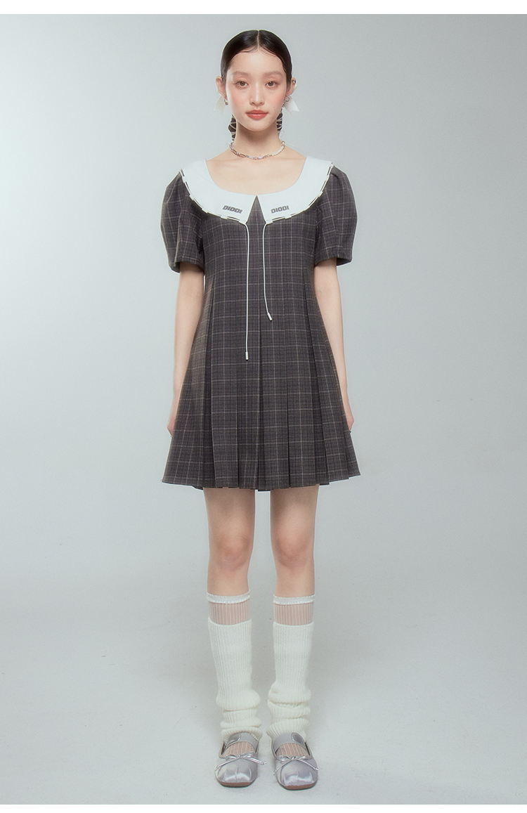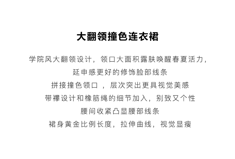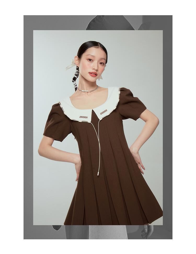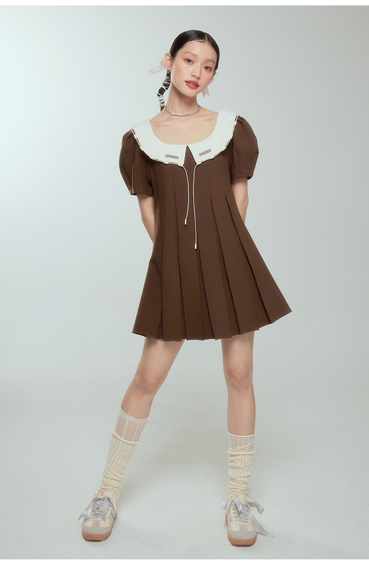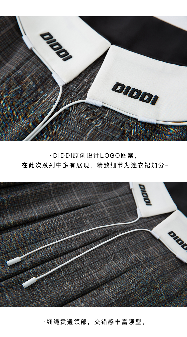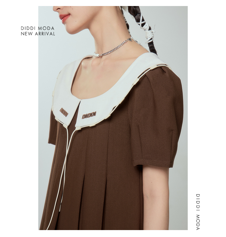 DIDDI 原創設計 u領拼接咖色a字短裙春學院風大翻領撞色連衣裙