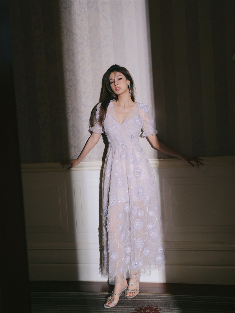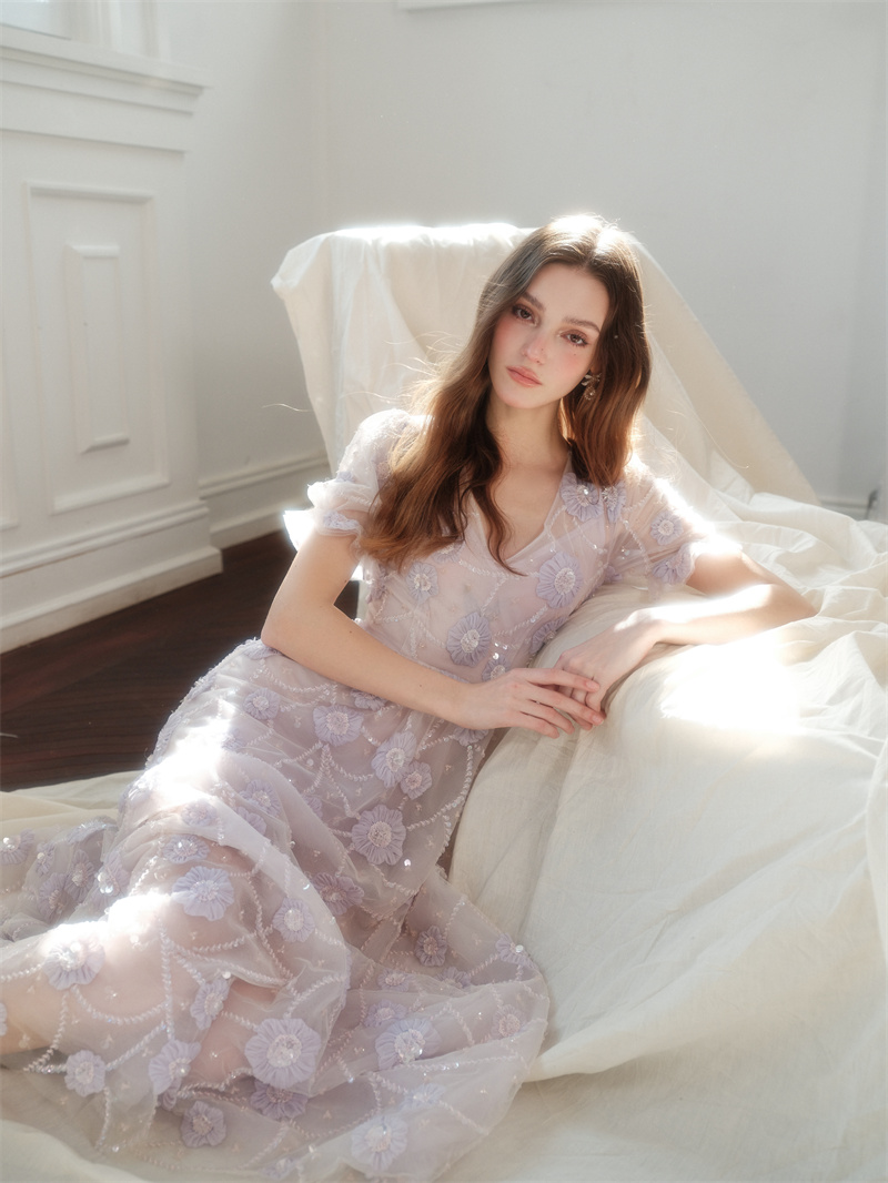 Wardrobes by chen 木蘭23新款 奢華淺紫花?繡珠v領連衣裙