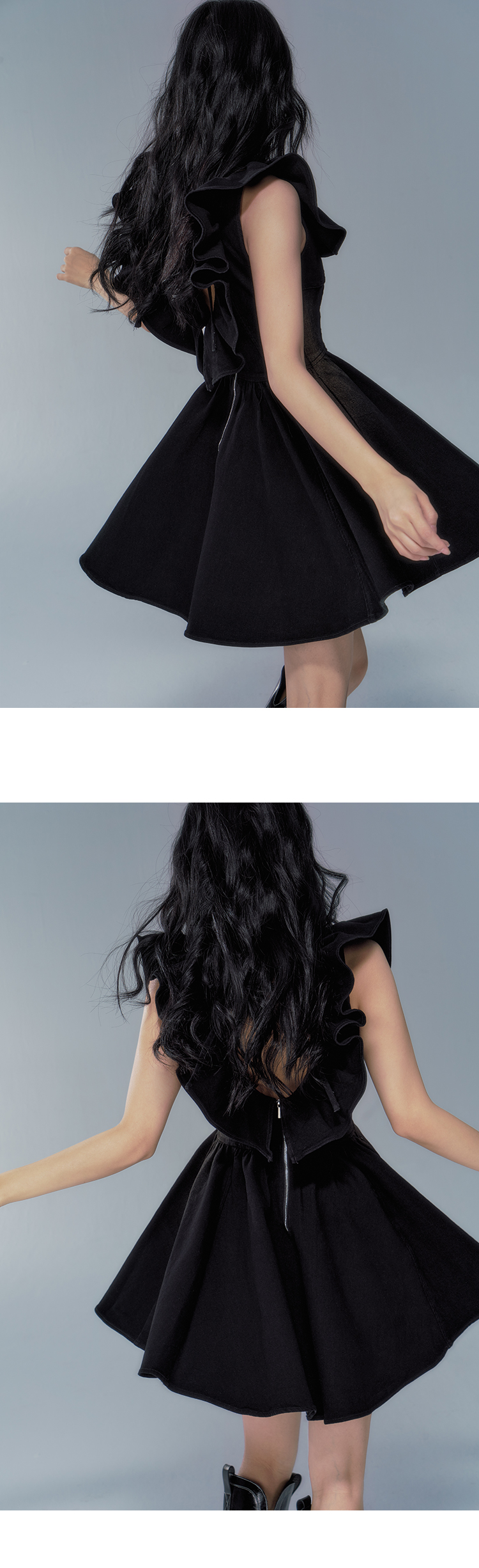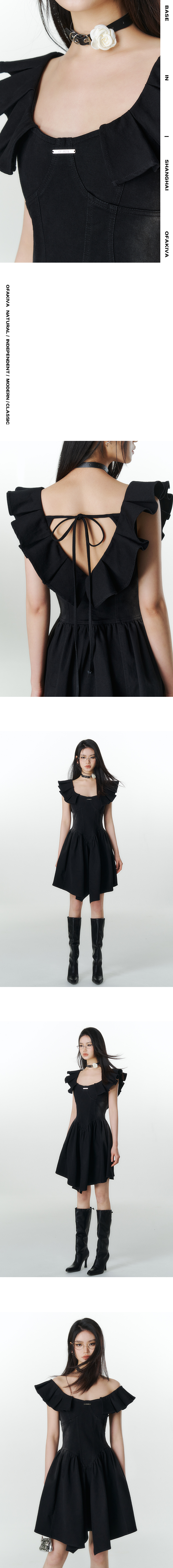 【現貨】OfAkiva 蝶翼掐腰黑牛連衣裙女夏季高腰無袖荷葉邊背心裙