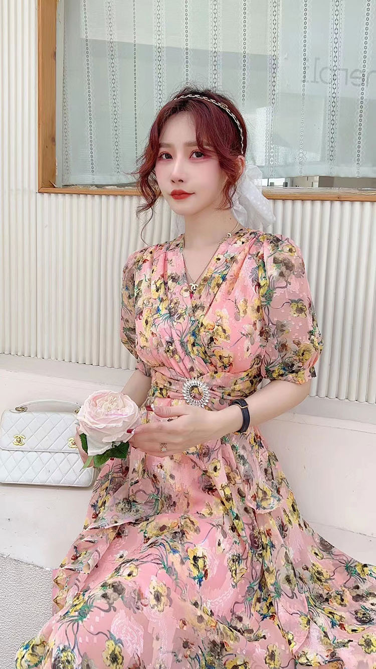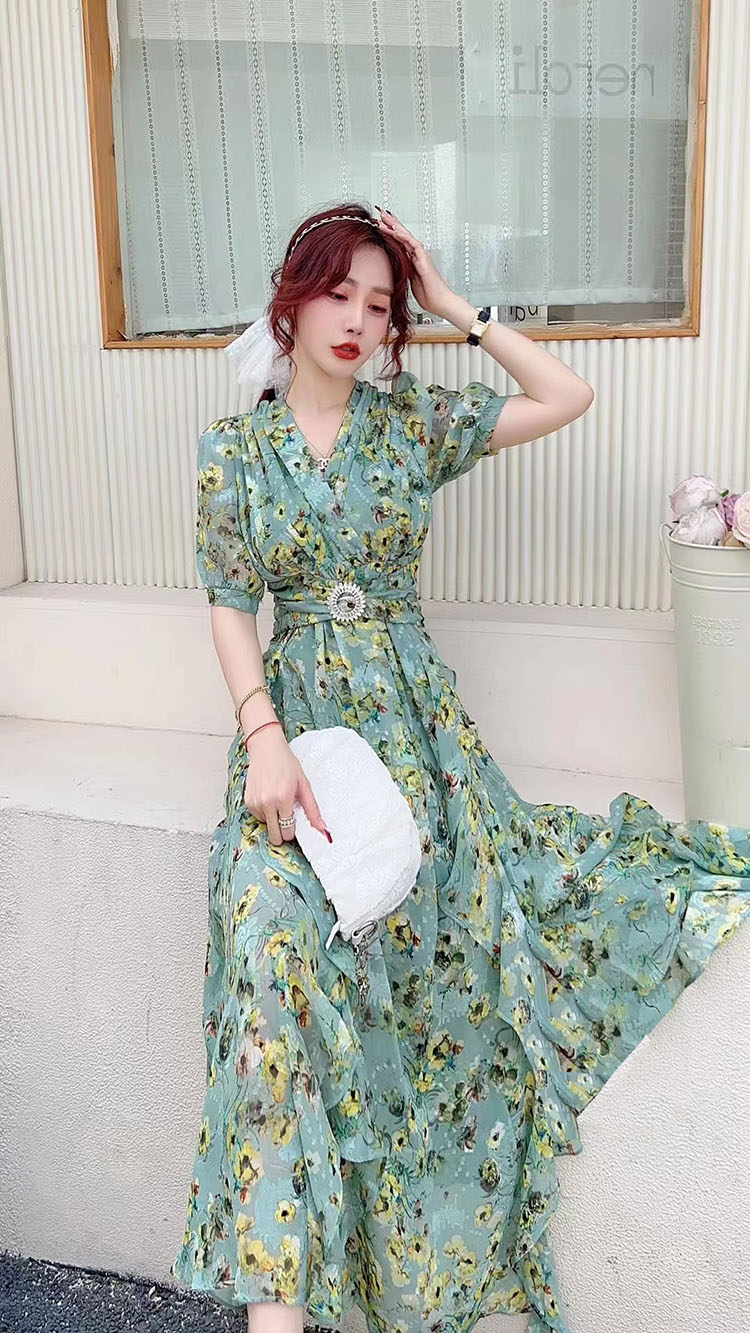 超長夏日新款雪紡印花顯瘦氣質收腰碎花連衣裙女清單到腳踝大擺裙