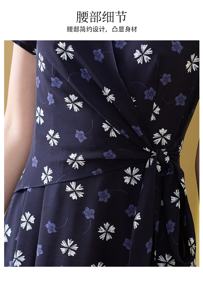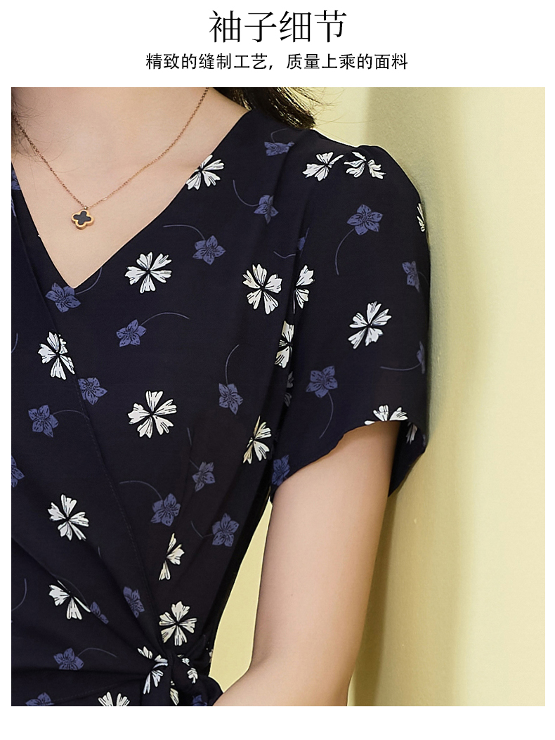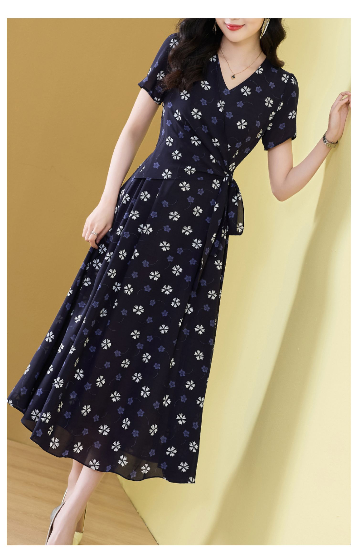 藍色碎花雪紡連衣裙女短袖2023年夏季新款高端名媛氣質顯瘦中長款
