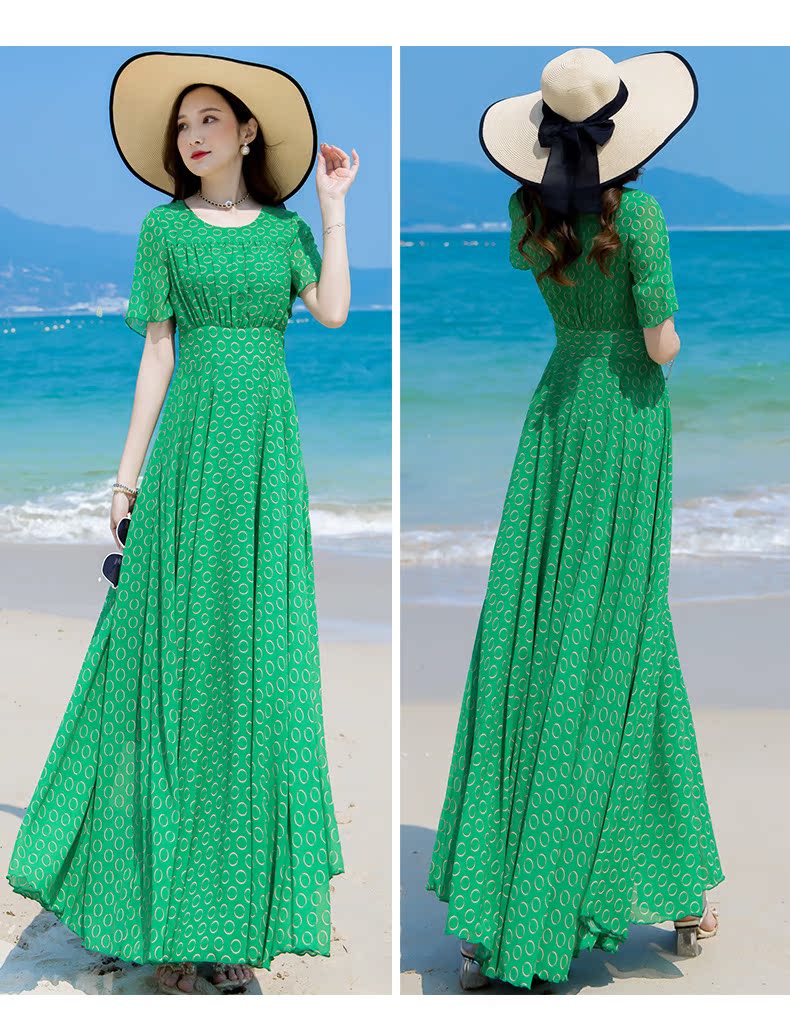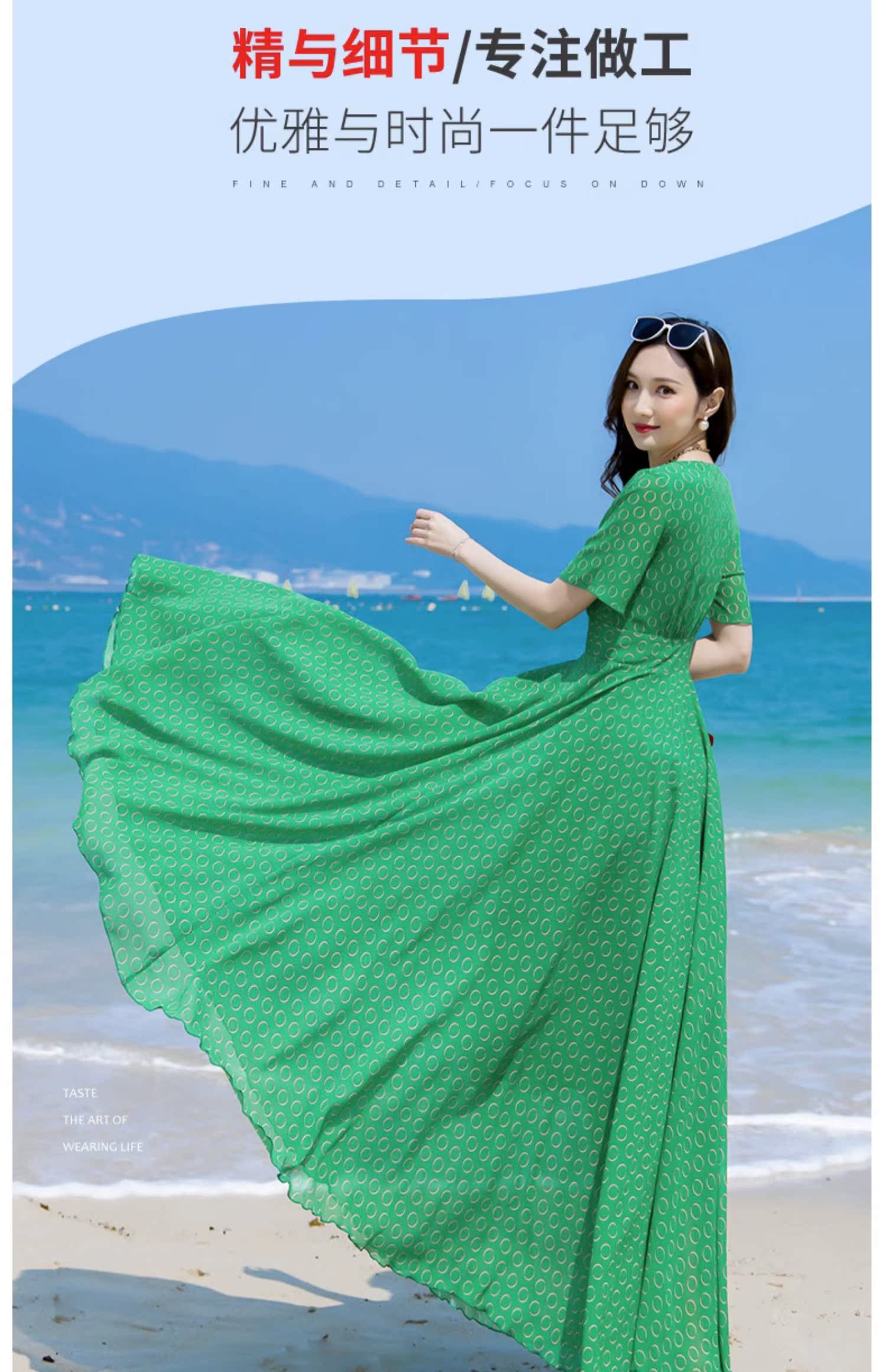 夏季綠色雪紡波點連衣裙女長款到腳踝2023新款超長顯瘦圓領大擺裙