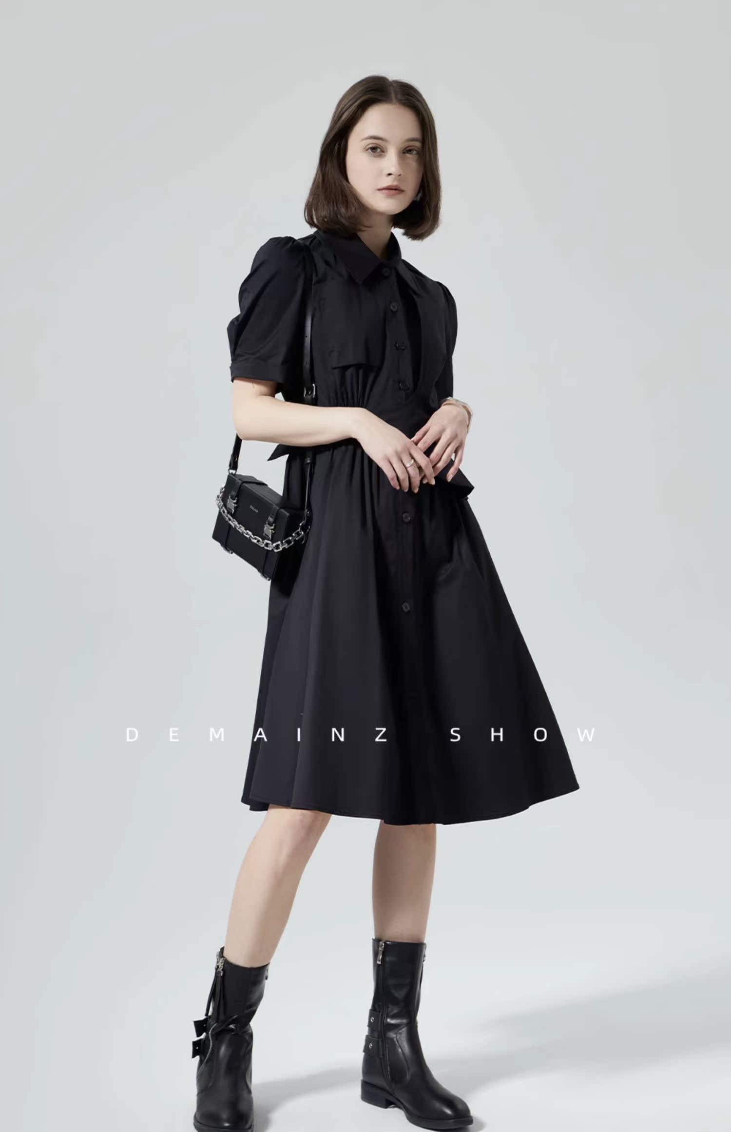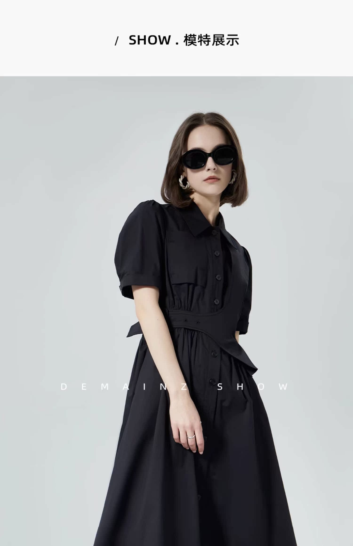 DEMAINZ地縵法式復古小香風黑色醋酸垂墜感連衣裙2023夏新款顯瘦