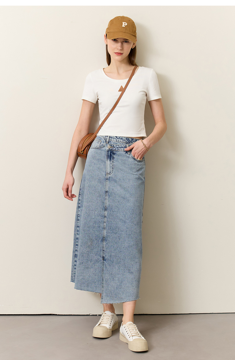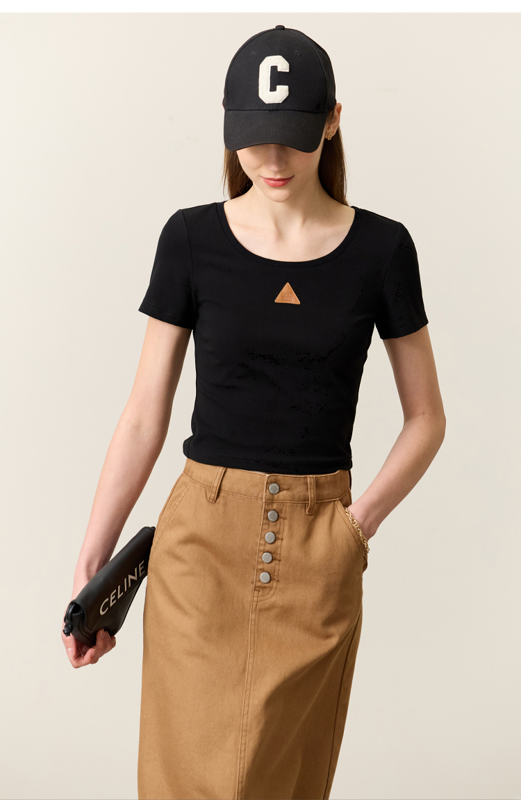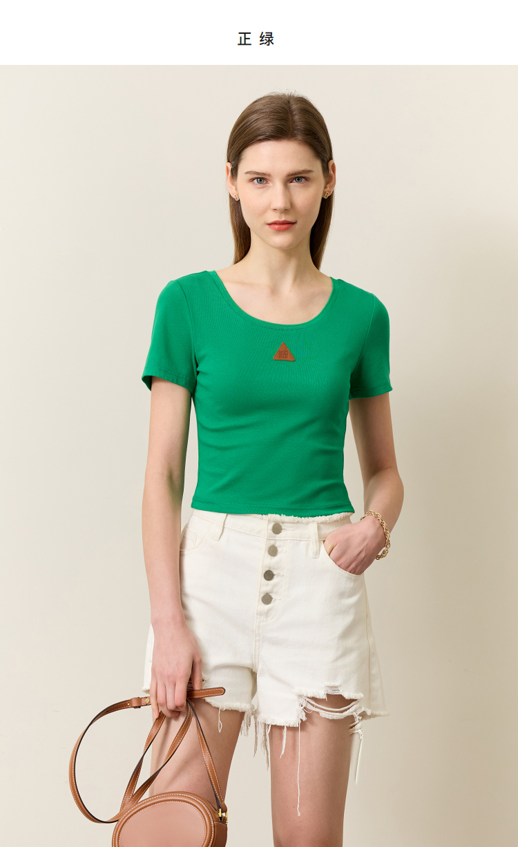 Amii2023夏新款極簡百搭短款三角皮牌修身羅紋拉架棉質短袖T恤