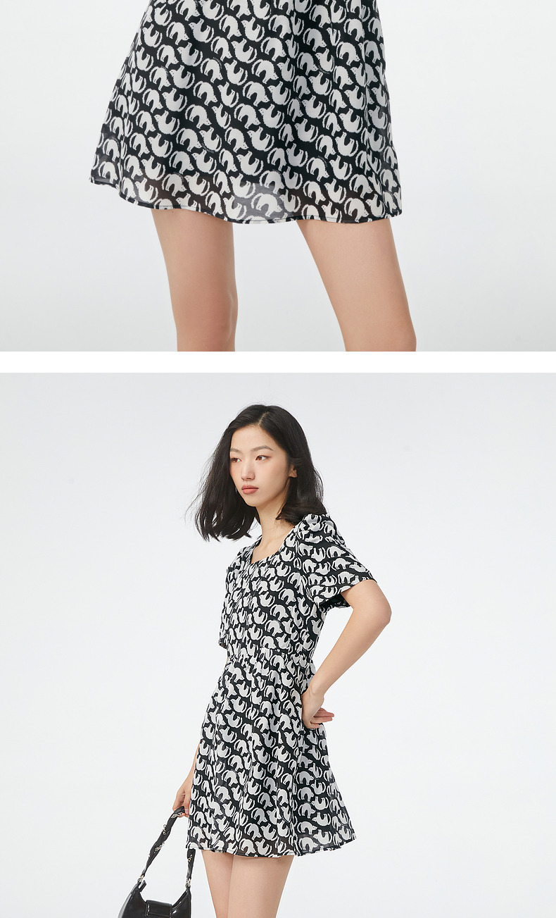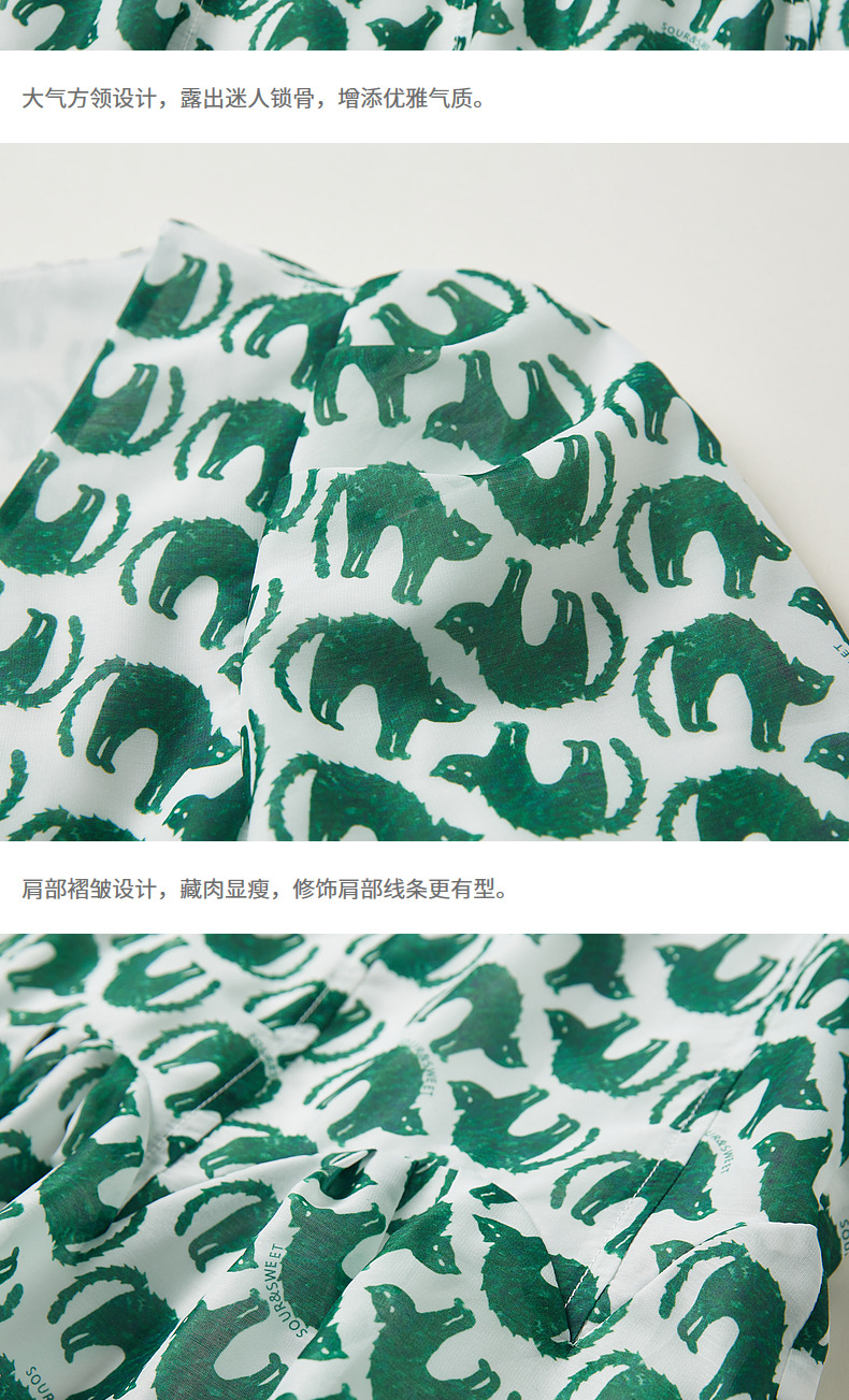 COLOVE卡拉佛印花短袖連衣裙女2023夏季新款法式浪漫泡泡袖裙子