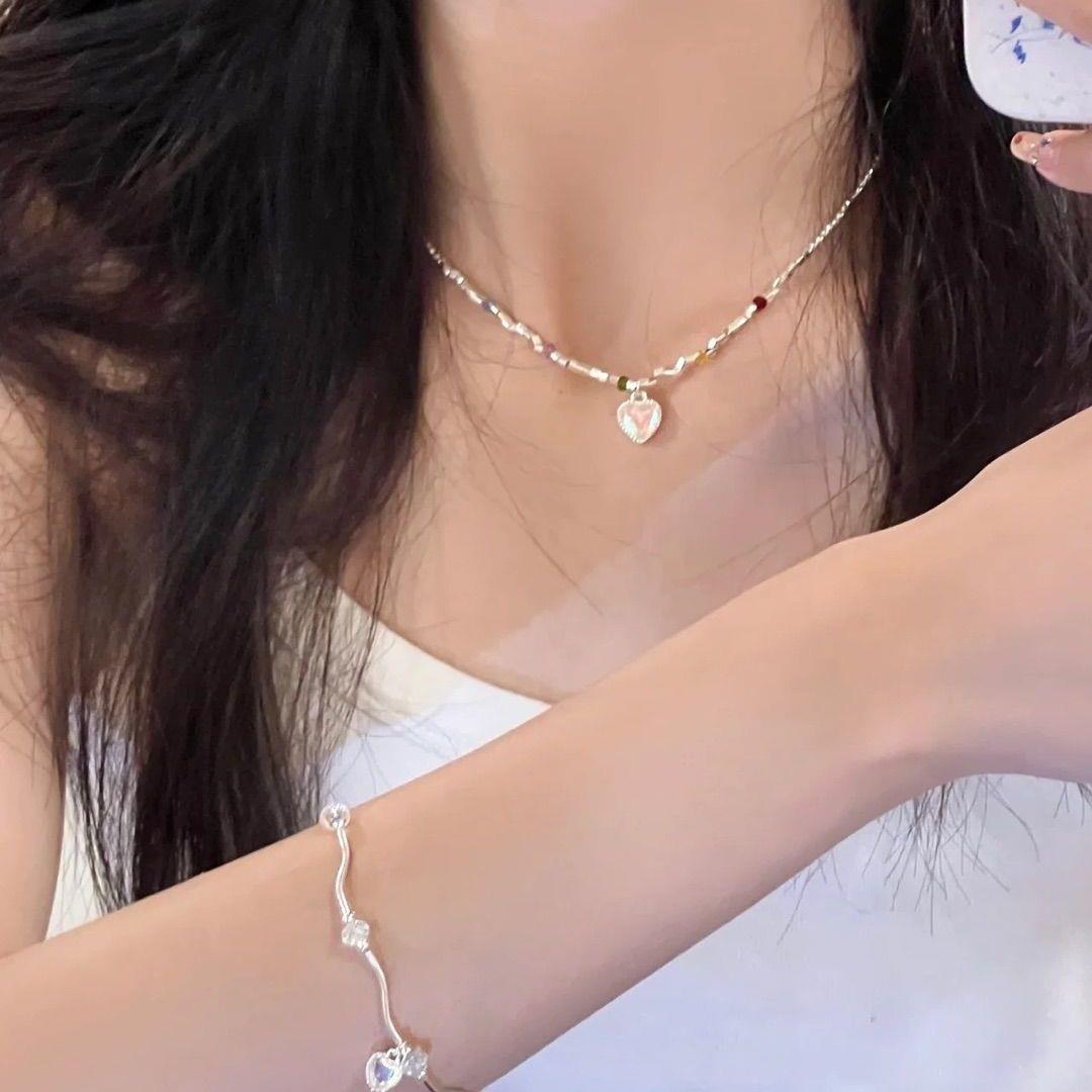 小米粒珍珠雙層項鏈女夏季頸鏈輕奢小眾感愛心鎖骨鏈生日禮物