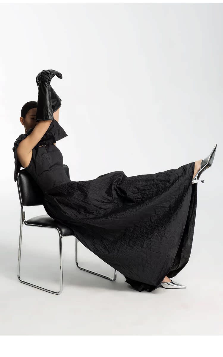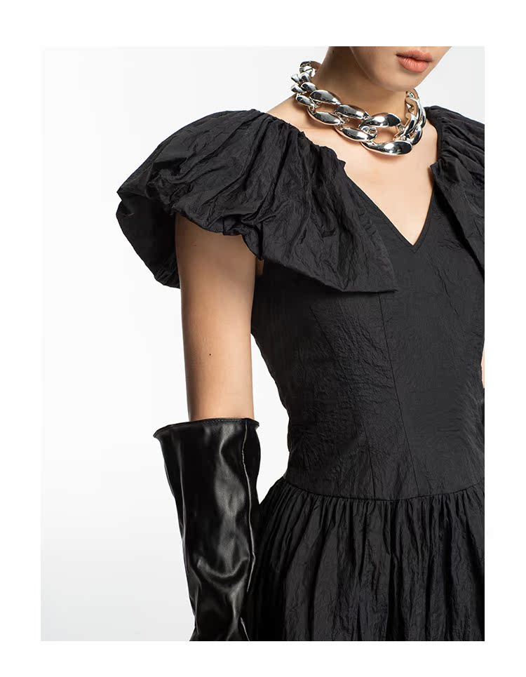 LEDIM WANG 荷葉袖大擺連衣裙女2023夏季收腰顯瘦赫本風小黑裙子
