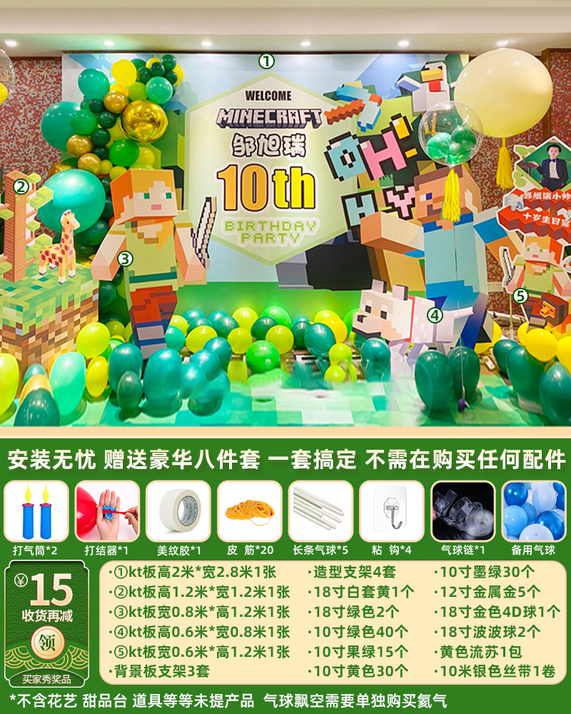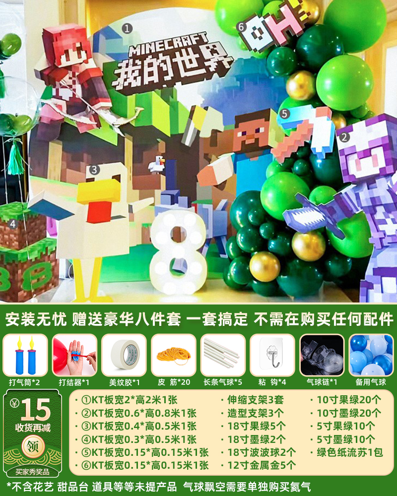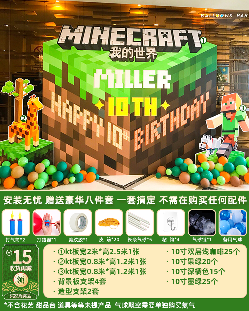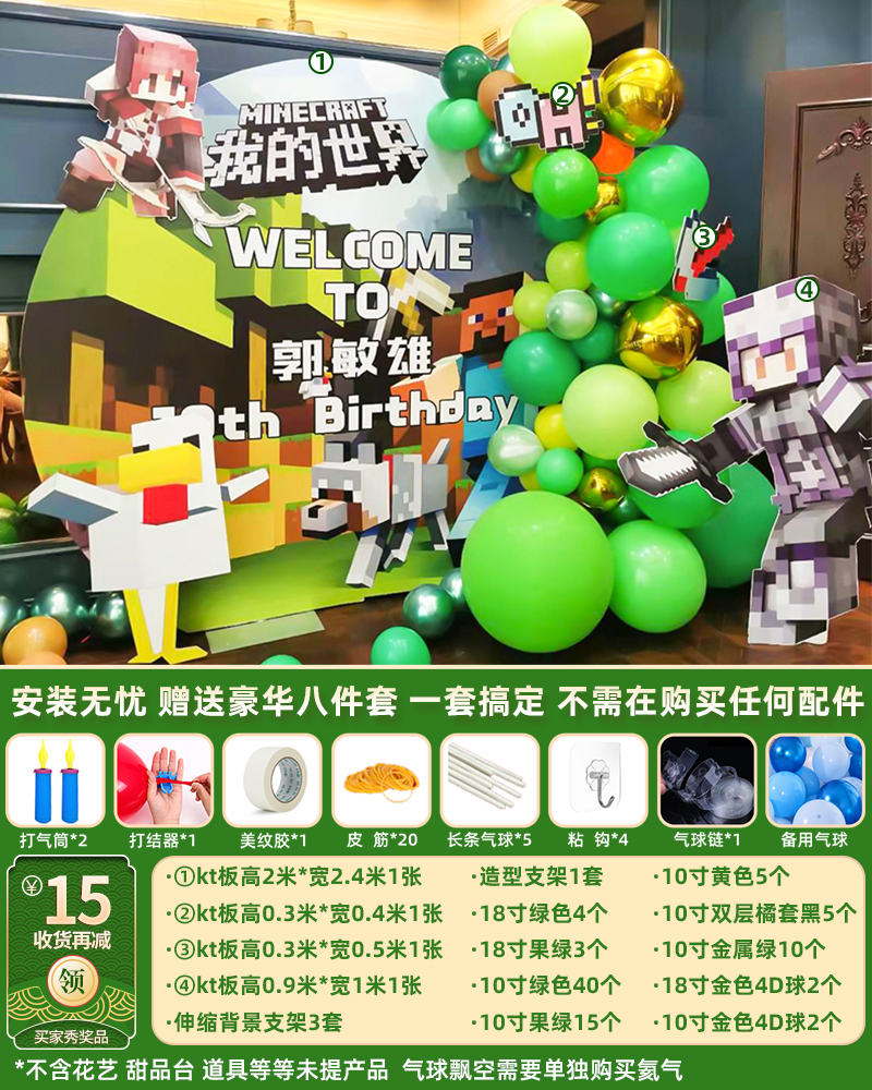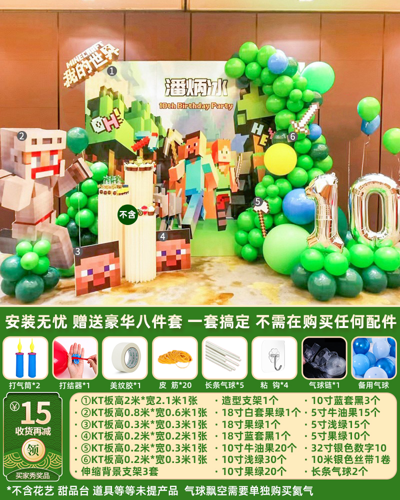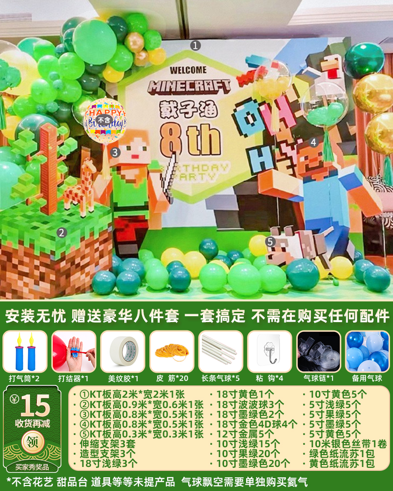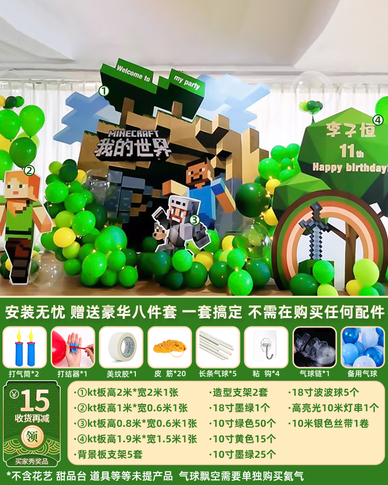 我的世界主題生日裝飾場景布置男孩派對10周歲氣球背景墻kt板套餐