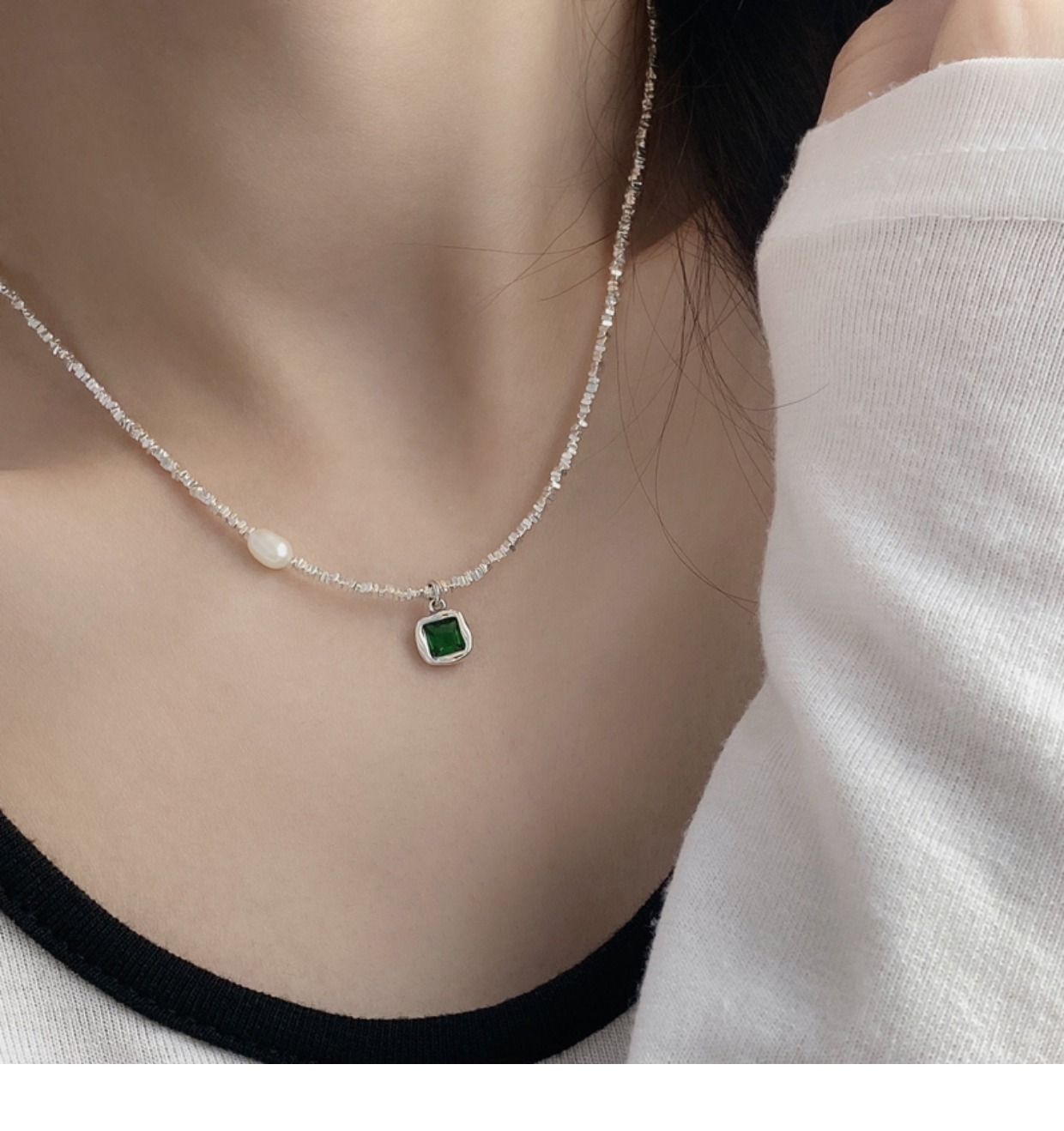 S925純銀簡約小清新碎銀綠鋯石方塊淡水珍珠項鏈夏季新款氣質鎖骨