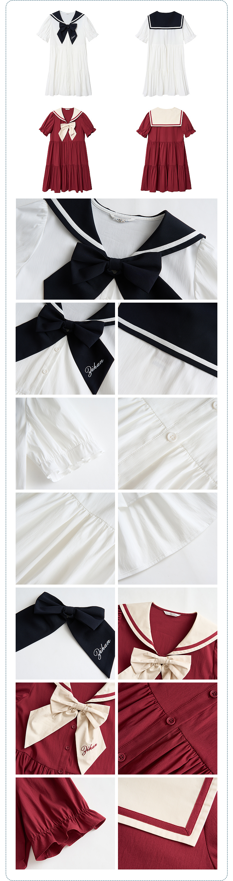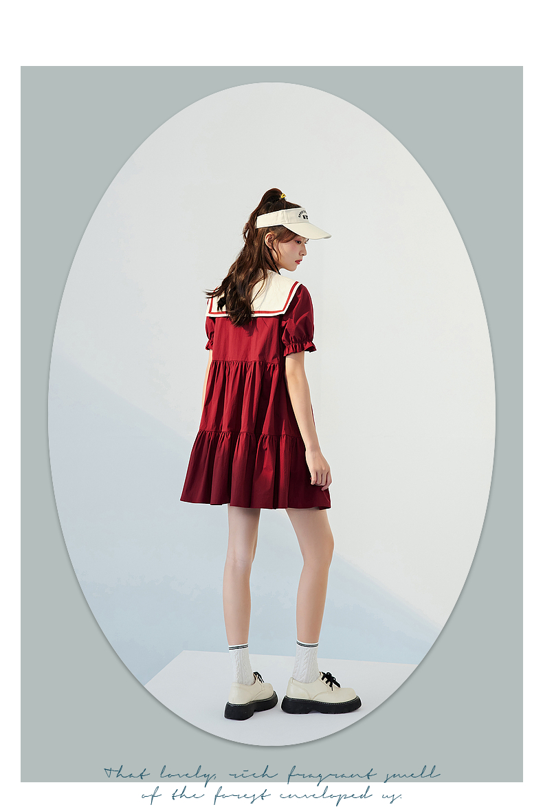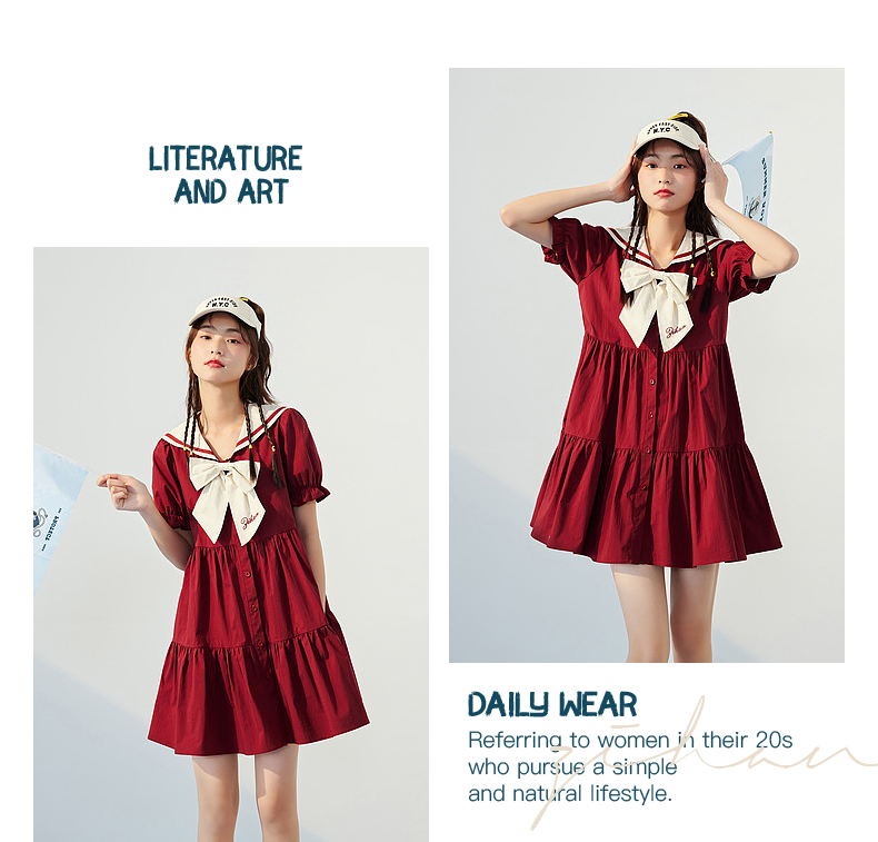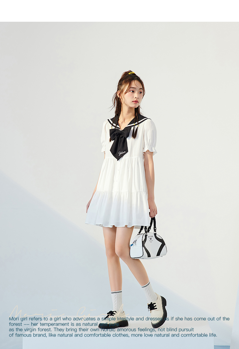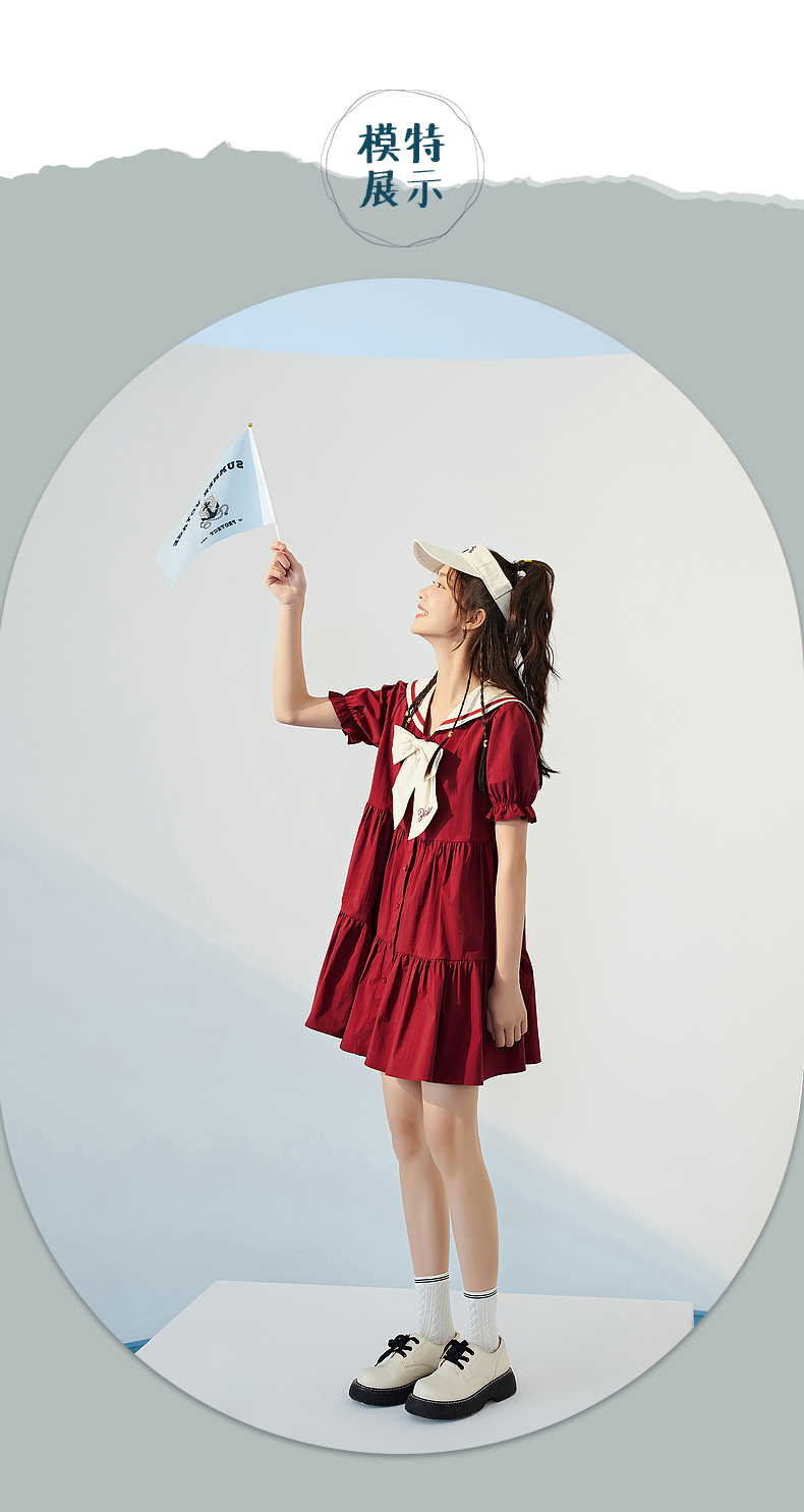 紫涵水手大翻領連衣裙泡泡袖抽褶娃娃裙夏季新款2023撞色蝴蝶結