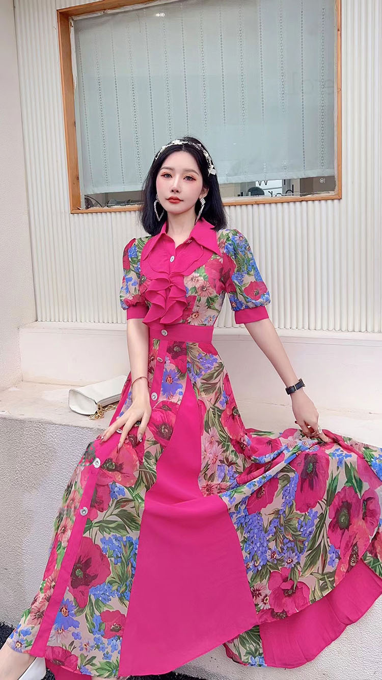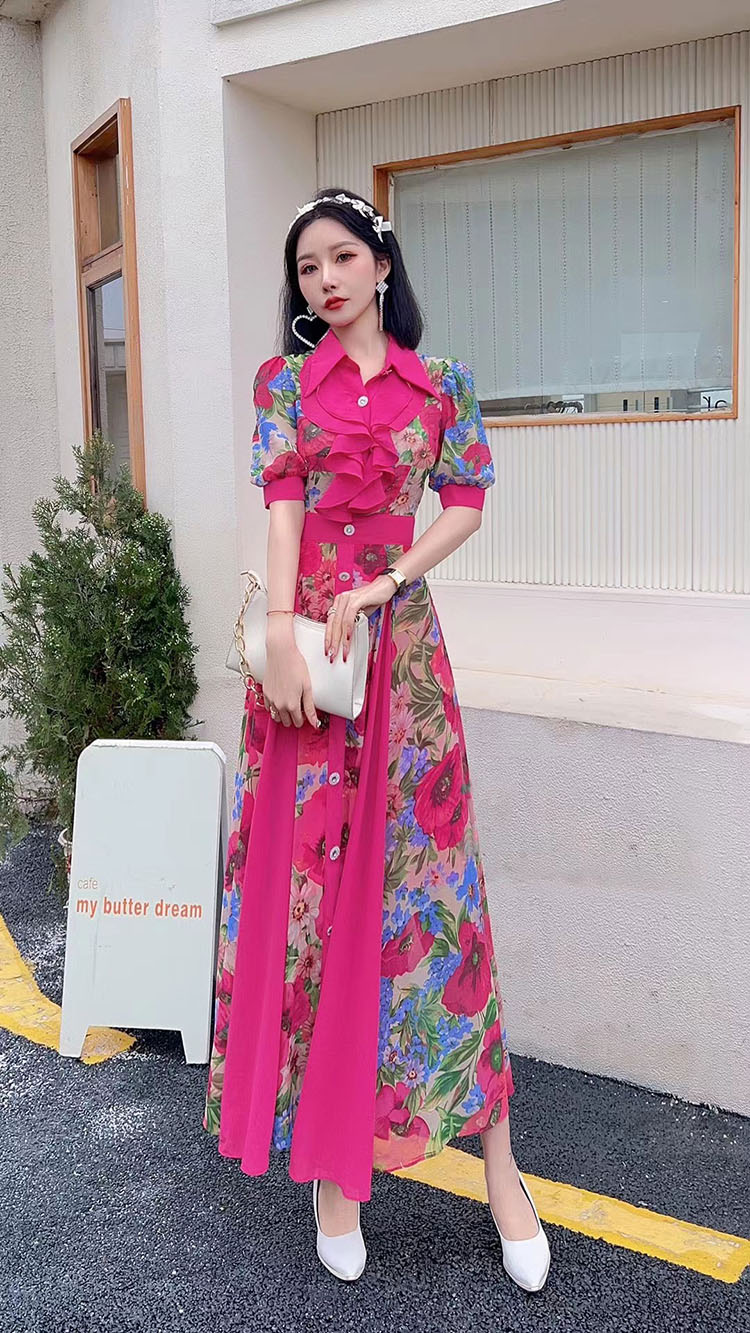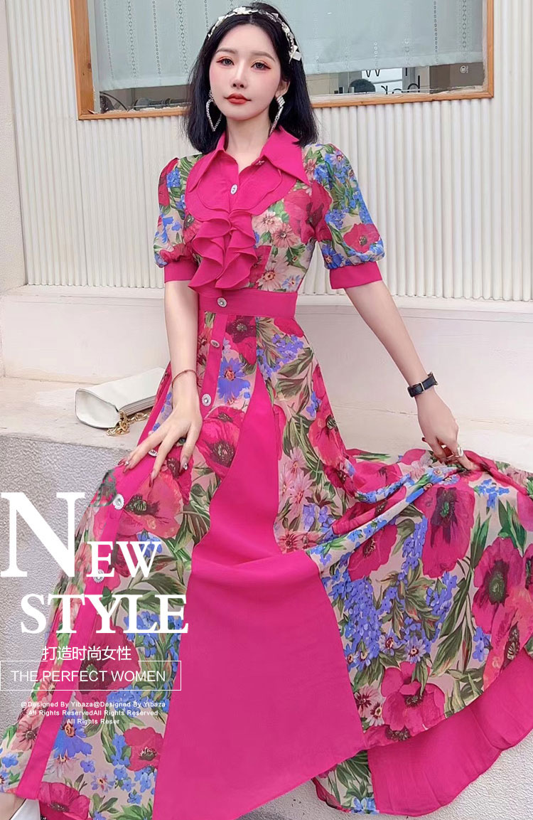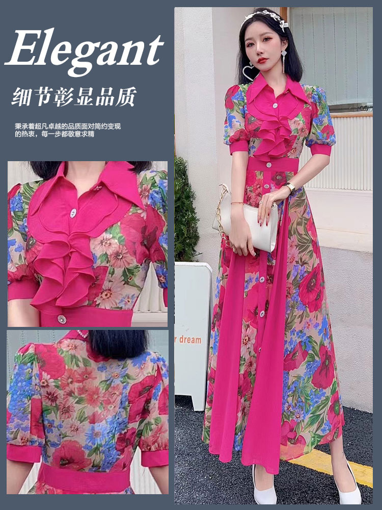 氣質印花荷葉邊高級感超長連衣裙女到腳踝修身顯瘦大擺裙夏季短袖