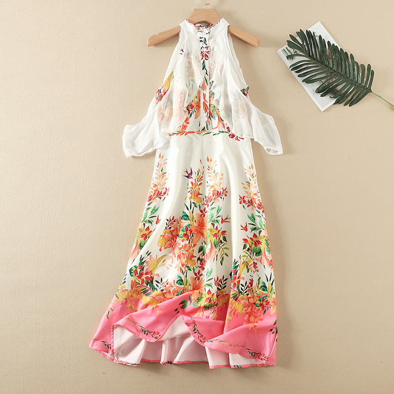 2689歐美風時尚掛脖式露肩連衣裙夏季女裝印花荷葉邊中長款女裙