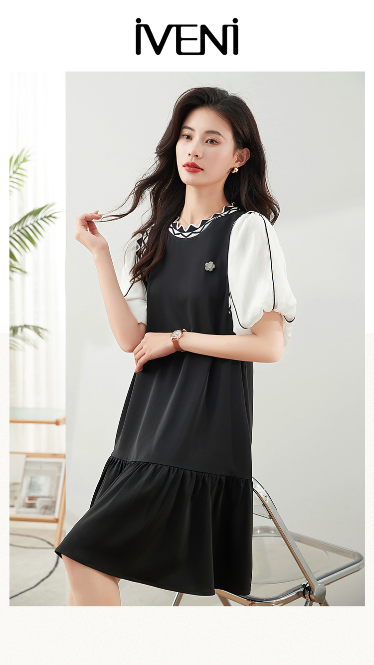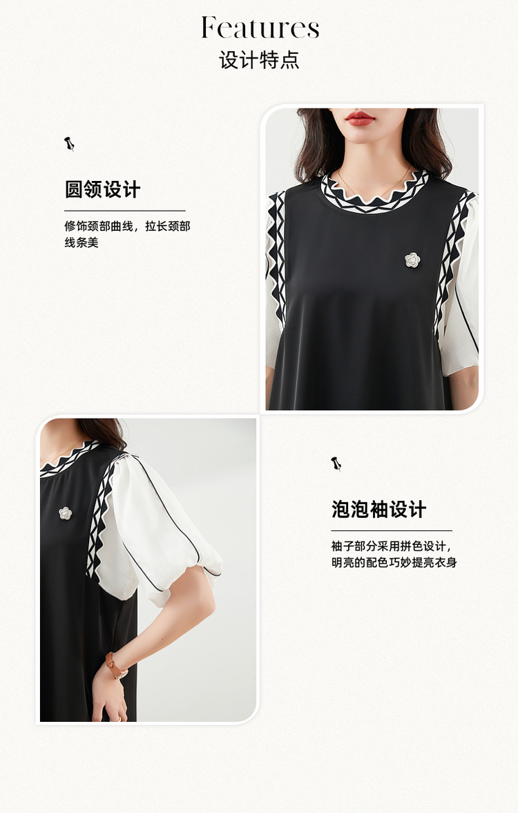 法式撞色燈籠袖拼接直筒裙2023夏季新款寬松顯瘦休閑設計感連衣裙