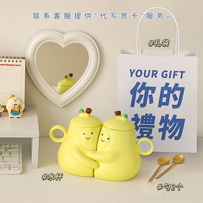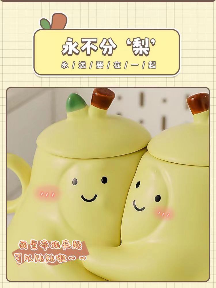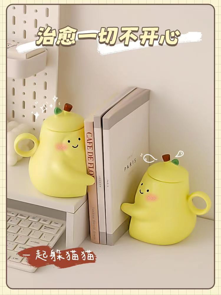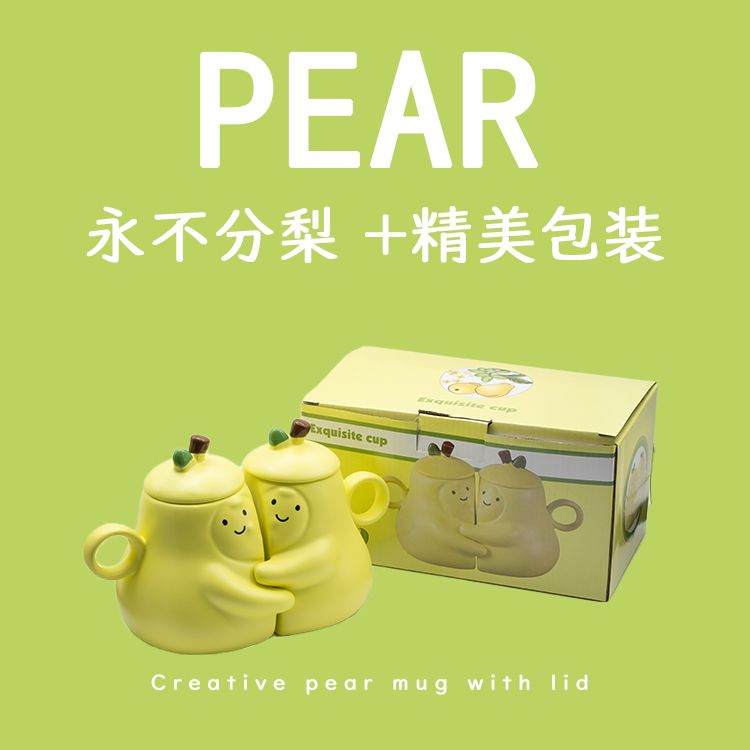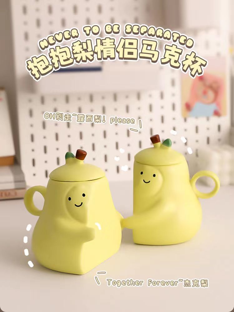 抱抱梨陶瓷水杯帶蓋情侶用卡通可愛送同學生日禮物馬克杯永不分離