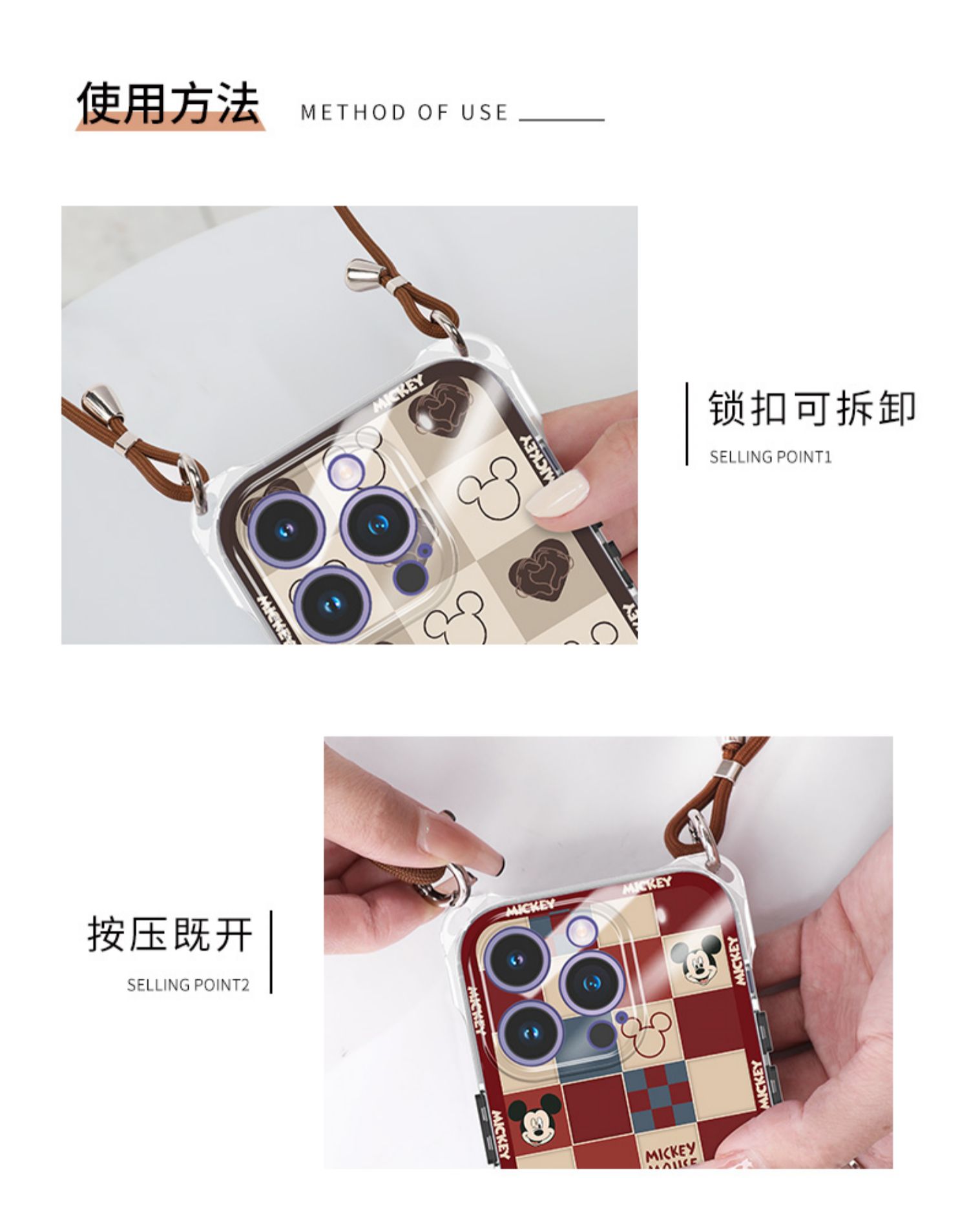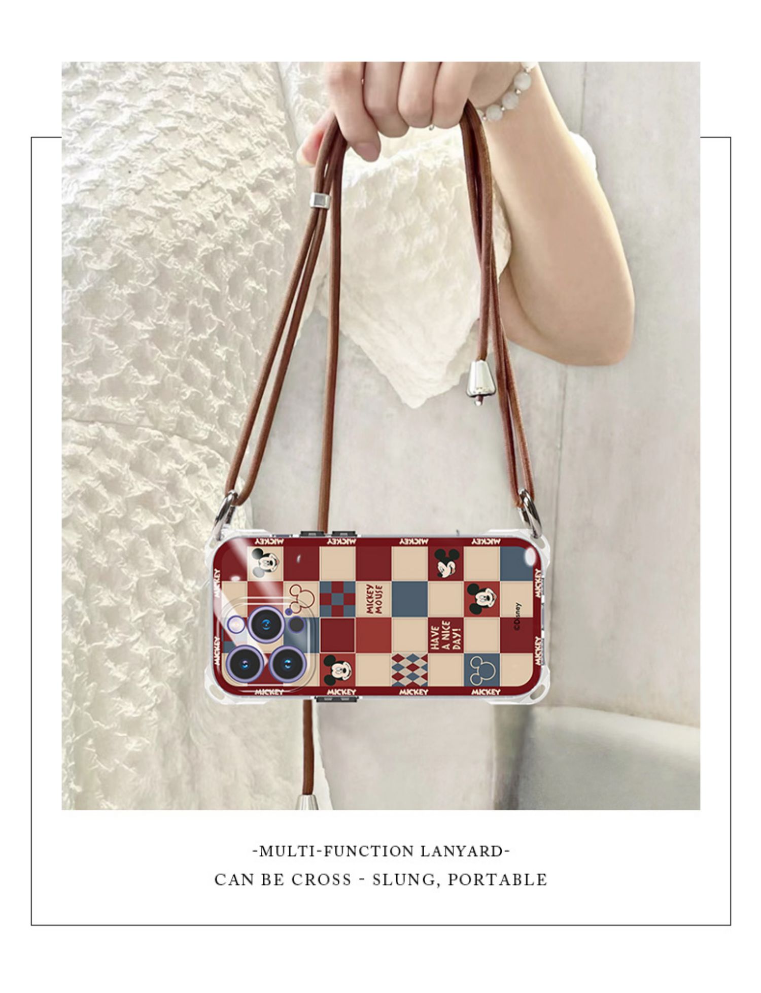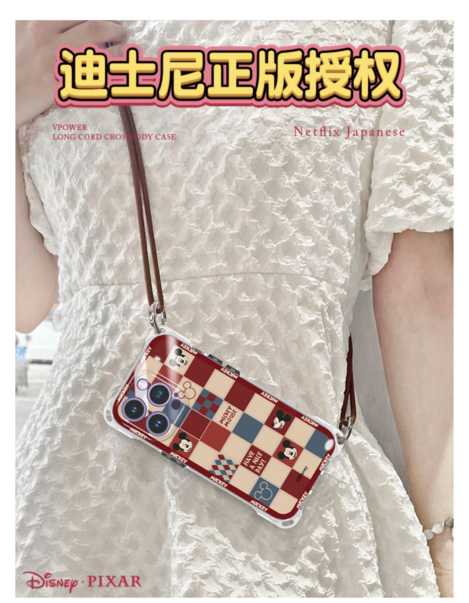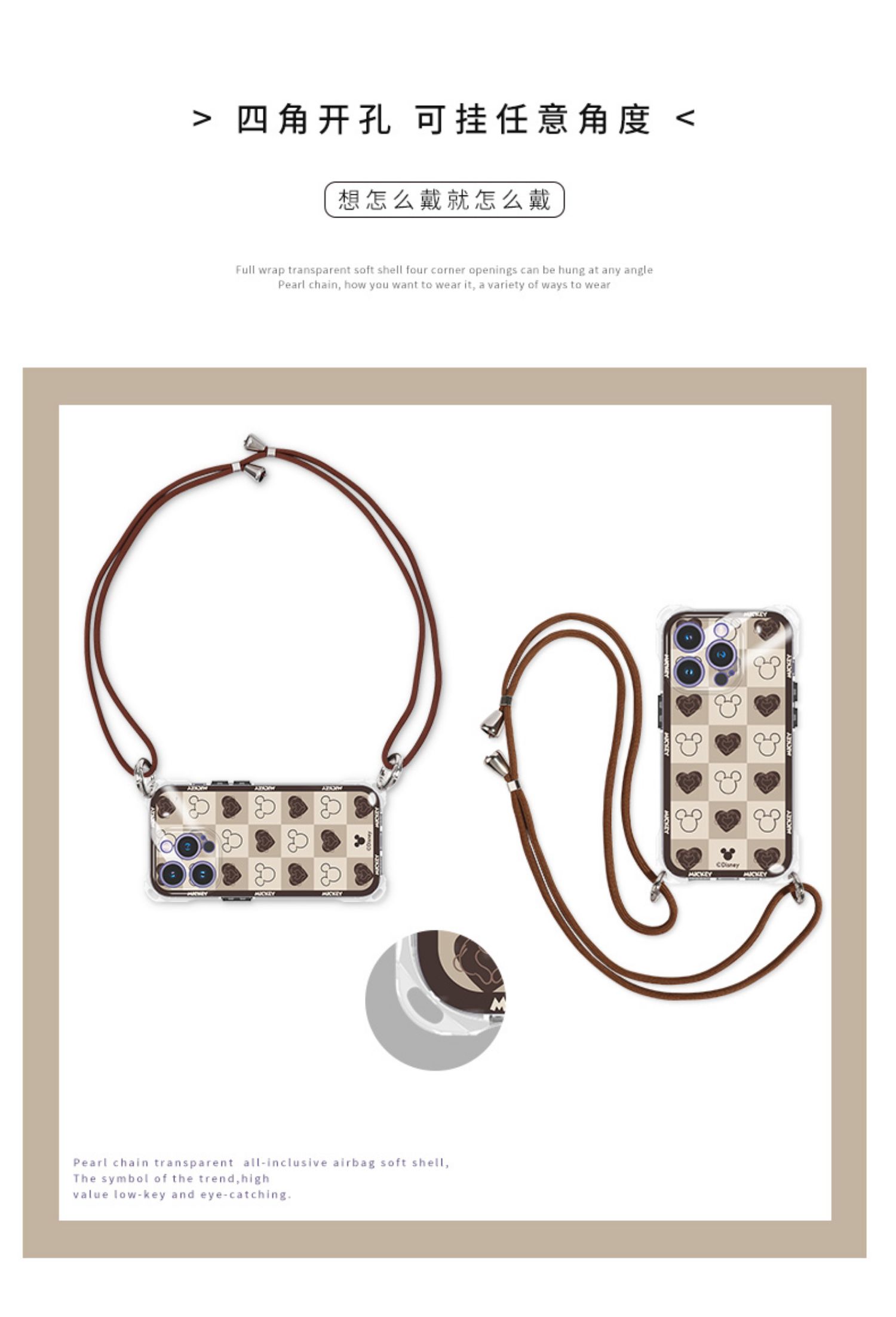 迪士尼適用iPhone15promax手機殼蘋果13斜挎掛脖11四角開孔防摔14plus新款帶掛繩女2023背帶包包設計師高端12