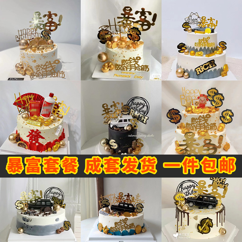 暴富蛋糕裝飾套餐插牌男神汽車金色亞克力錢標生日搖錢樹插件套裝