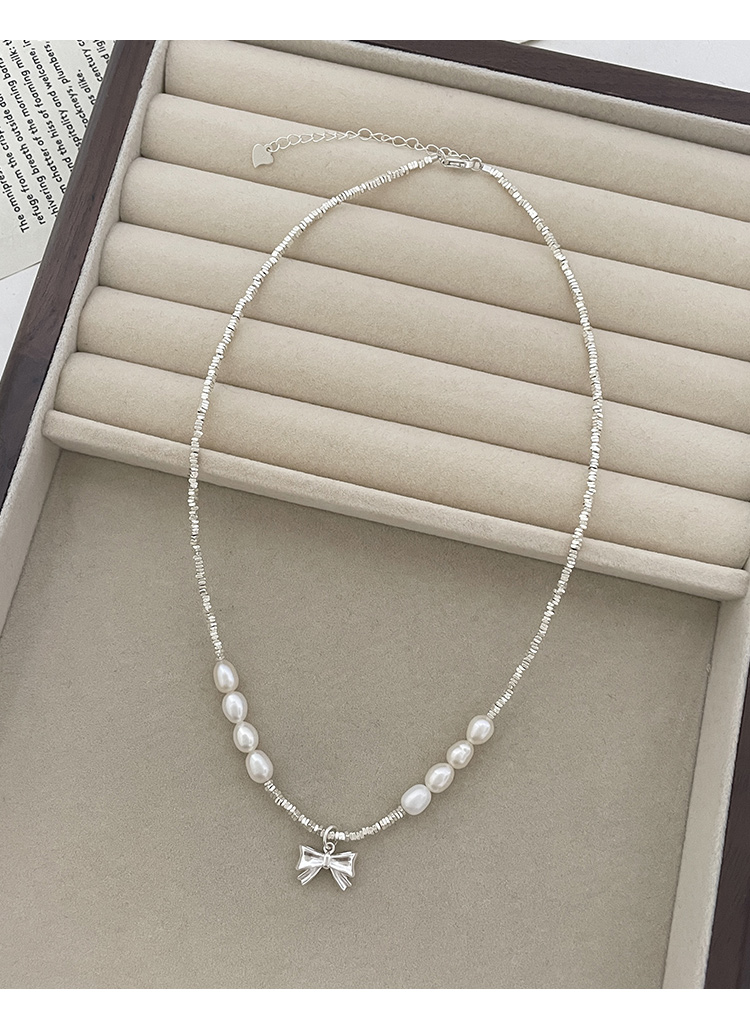 925純銀天然珍珠碎銀子項鏈女蝴蝶結吊墜鎖骨鏈高級輕奢小眾頸鏈