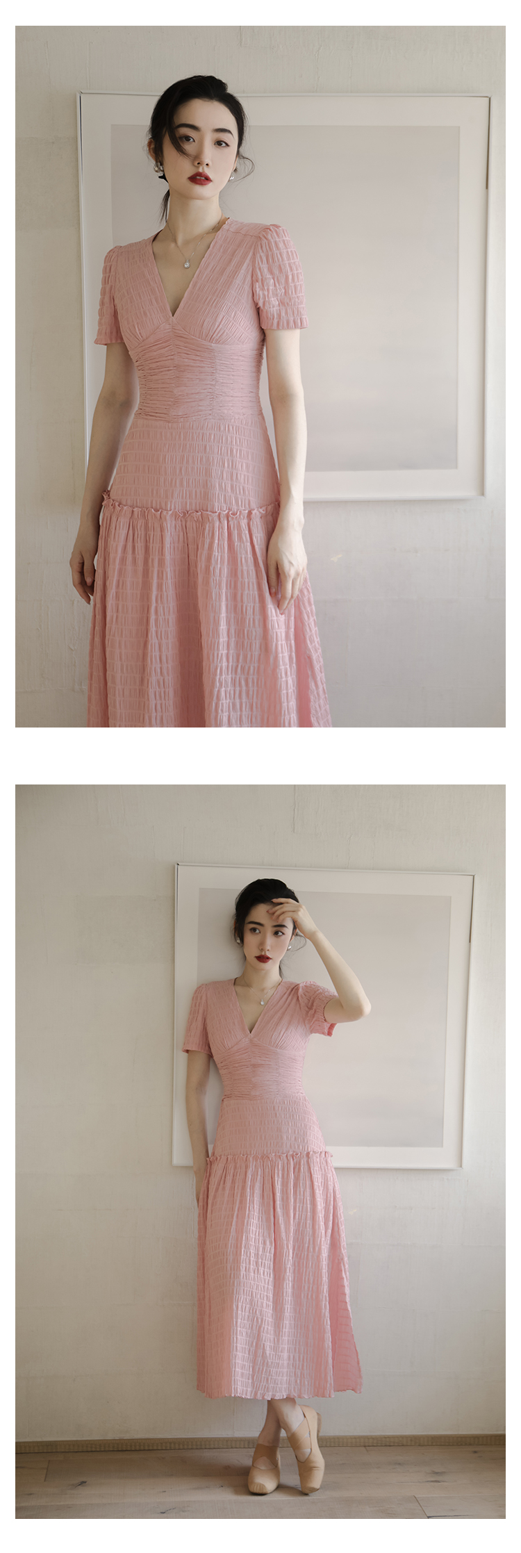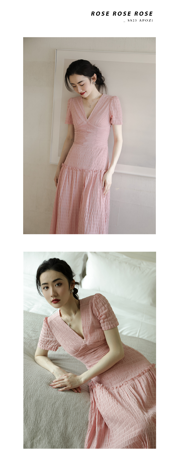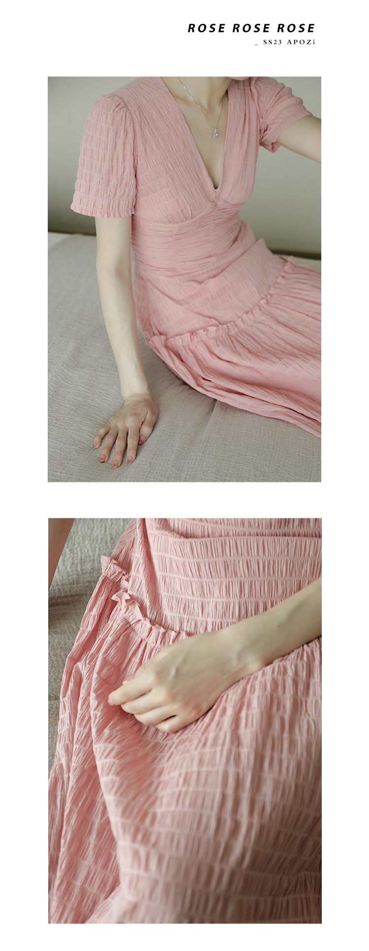 APOZi 2023夏季新款度假系列沁人粉短袖茶歇法式連衣裙顯瘦高級感