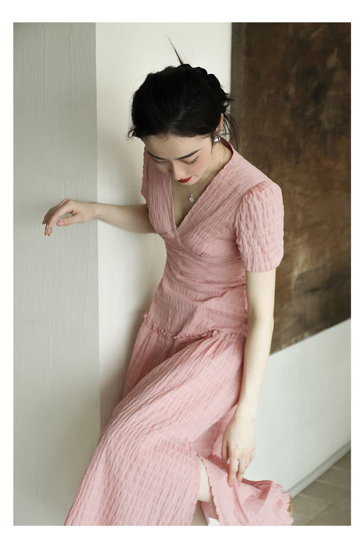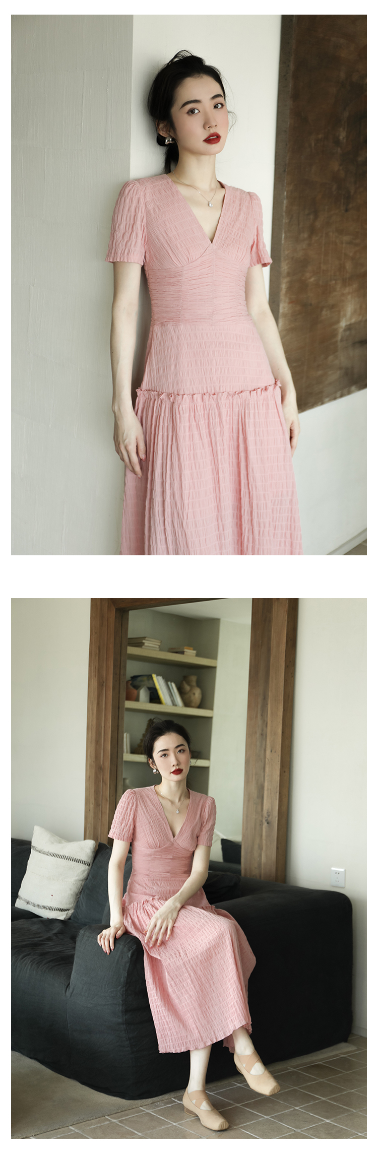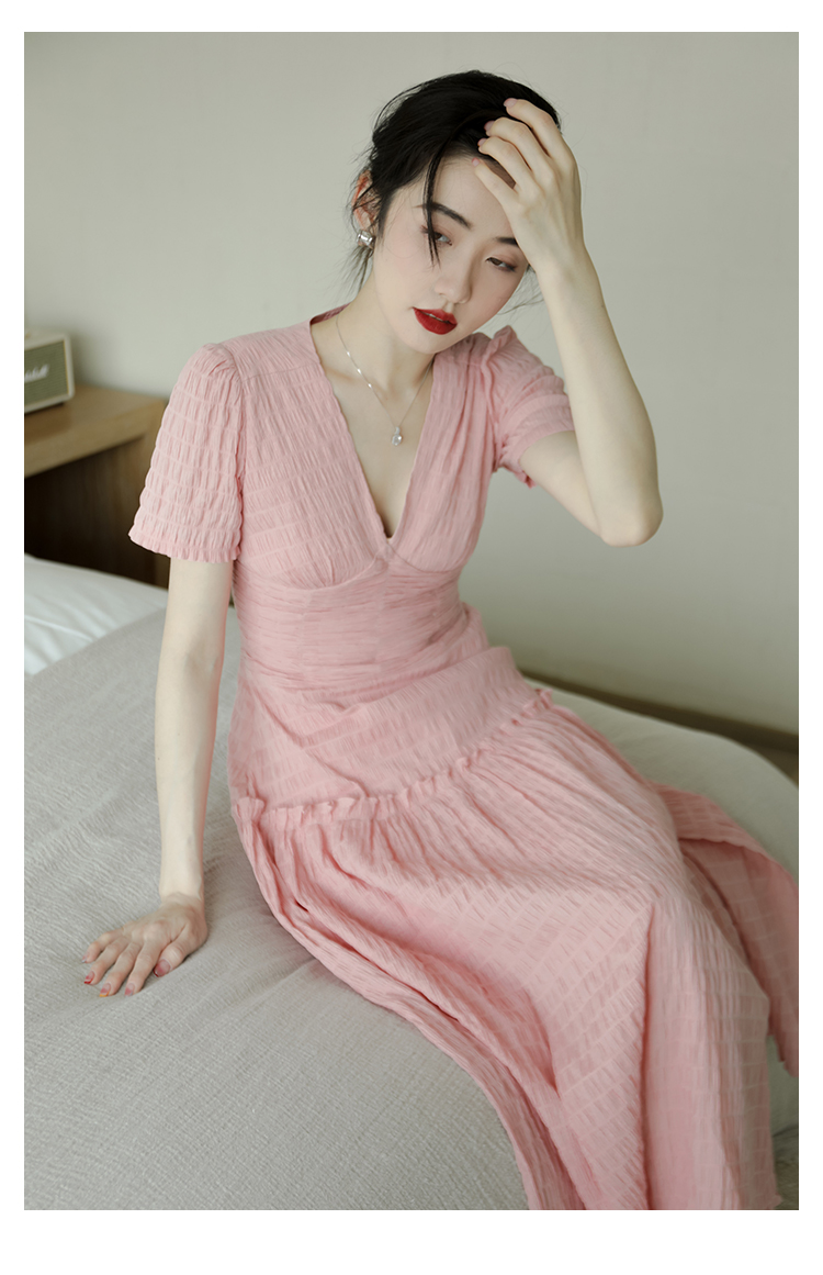 APOZi 2023夏季新款度假系列沁人粉短袖茶歇法式連衣裙顯瘦高級感