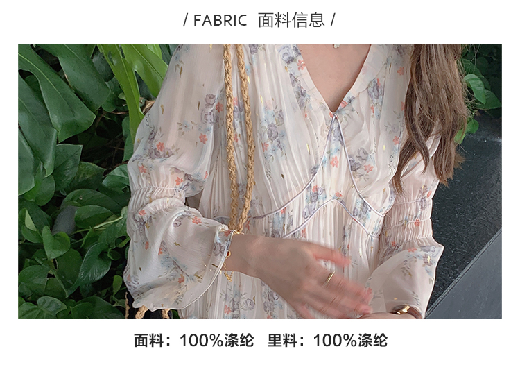 人間四月天~印花v領燈籠袖長袖收腰雪紡連衣裙碎花長裙溫柔小個子